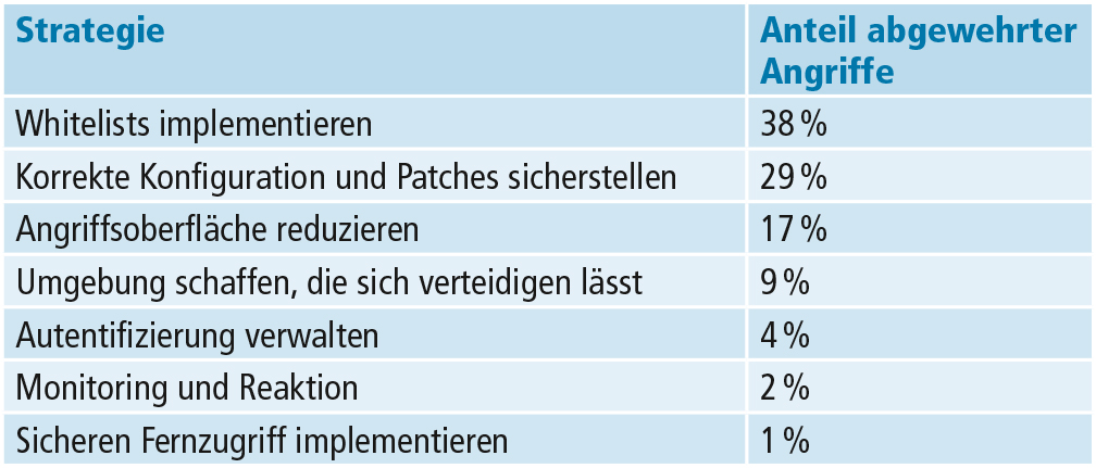 ICS-Cert empfiehlt Unternehmen, zuerst eine gründliche Risikoanalyse durchzuführen, bevor Abwehrmassnahmen ergriffen werden. In der Tabelle ist die prozentuale Wirksamkeit der durch ICS-Cert empfohlenen Massnahmen aufgeführt. Detailliertere Erläuterungen mit guten Beispielen zu den sieben Massnahmen findet man in [1].