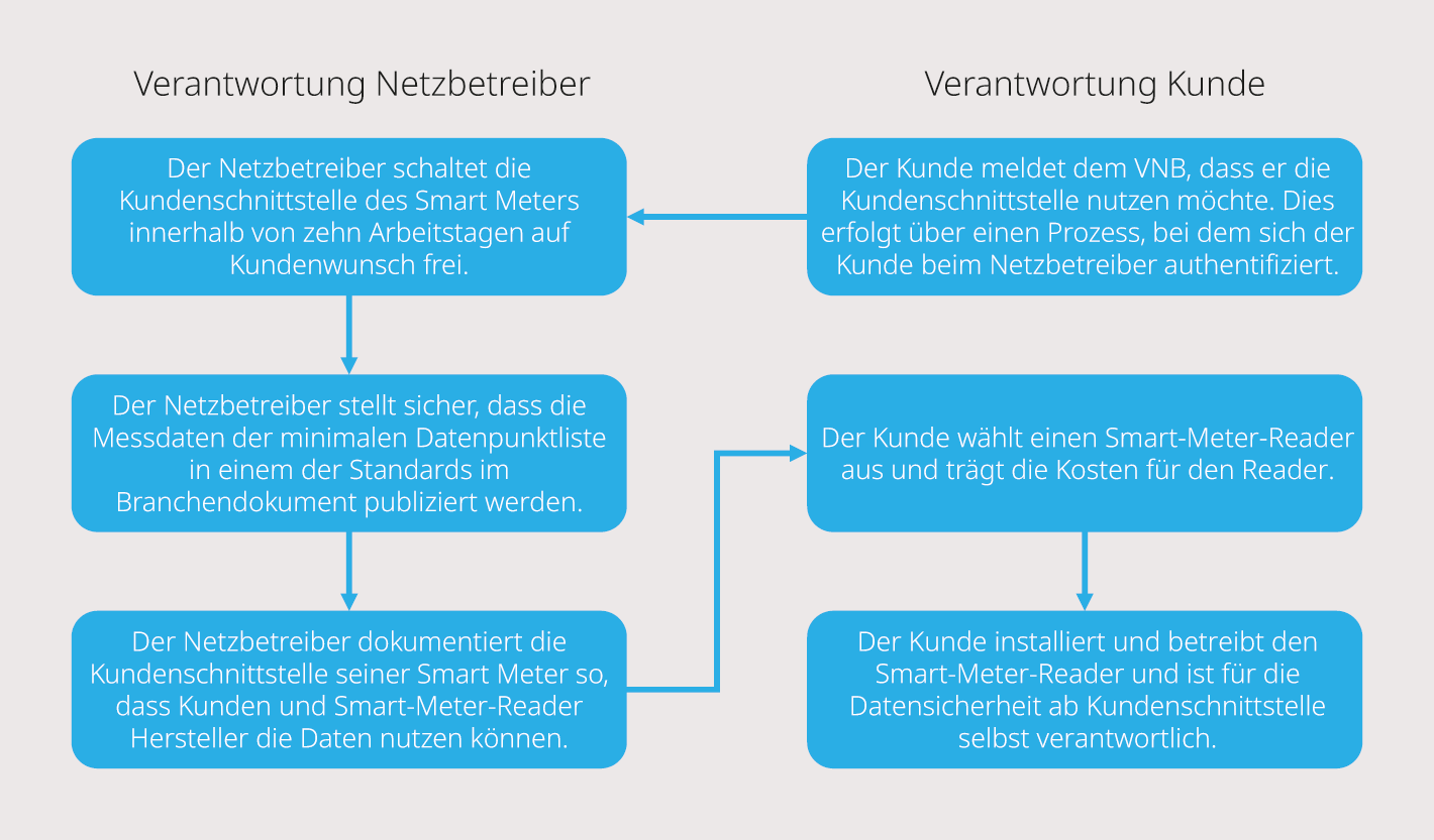 Die Aktivierung der Kundenschnittstelle erfolgt auf Antrag des Kunden. Die Netzbetreiber sind verpflichtet, technische Spezifikationen sowie Informationen zur Datenpunkt-Verfügbarkeit öffentlich zugänglich zu machen und einen sicheren Betrieb zu gewährleisten. Damit wird nicht nur dem Datenschutz, sondern auch dem Innovations- und Wettbewerbsprinzip Rechnung getragen: Drittanbieter und Start-ups erhalten standardisierten Zugang zu relevanten Messdaten und können kundenorientierte Mehrwertdienste entwickeln. Bild 2 illustriert die Verantwortlichkeiten gemäss VSE-Branchendokument bei der Nutzung der Kundenschnittstelle.