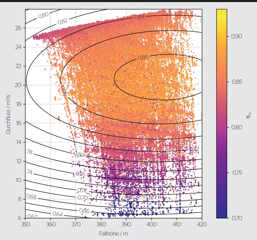 Die Effizienz einer Turbine im Betrieb wird vom Durchfluss und der Nettofallhöhe bestimmt. Da im KIDS Durchfluss, hydraulischer Druck und elektrische Leistung gespeichert werden, können Wirkungsgrade jeder Turbine oder Pumpe aus den Messdaten für alle im Betrieb aufgetretenen Arbeitspunkte berechnet werden. In Bild 2 sind Wirkungsgradwerte für die Arbeitspunkte von Turbine 2 im Zeitraum 2022 – 2024 dargestellt. Die Grenzen der Genauigkeit von Datenerhebung und Datenanalyse werden durch die wolkenförmige Verteilung der einzelnen Punkte sichtbar.