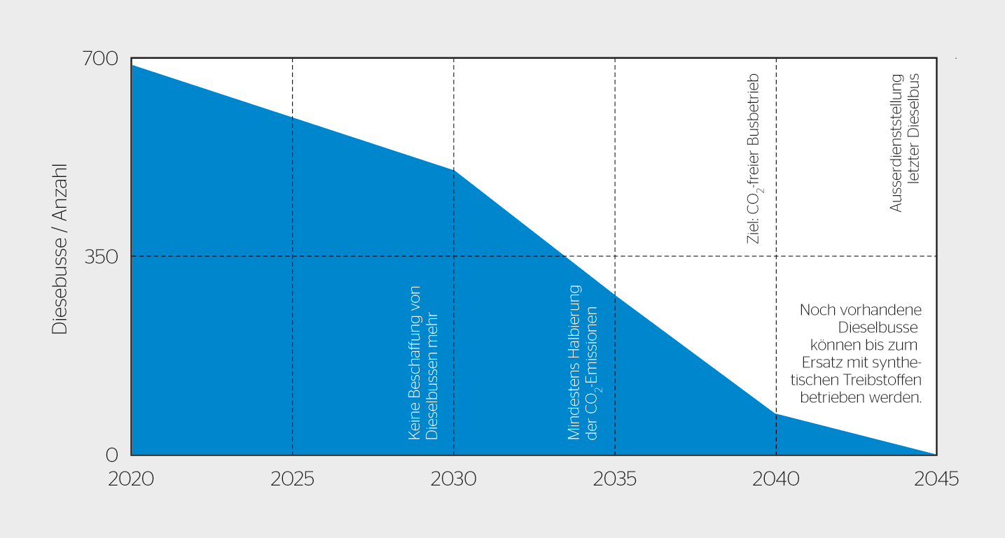 Die Elektrifizierung wird dabei schrittweise eingeführt – einerseits, um im Einsatz stehende Dieselbusse noch nutzen zu können, bis sie abgeschrieben sind. Dies erreichen die Busse je nach Verkehrsbetrieb und Nutzung nach zehn bis fünfzehn Jahren beziehungsweise manchmal weit über 1 Mio. km. Andererseits, um mit den elektrischen Bussen auf spezifischen Linien Erfahrungen zu sammeln, damit der Ausbau des Netzes sorgfältig ausgeführt werden kann.