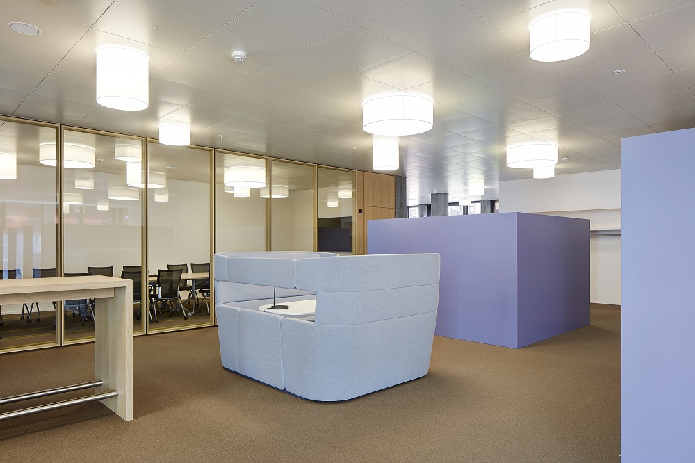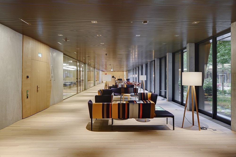 Die Bürogeschosse wurden nach dem Business Club Konzept konzipiert. Ein besonderer Fokus liegt dabei auf der Vielfalt des Raumangebotes. Je nach Aufgabe und persönlichen Bedürfnissen steht eine breite Palette an geteilten Arbeitsplätzen und -zonen zur Auswahl. Für die Mitarbeiterinnen und Mitarbeiter bedeutete dies eine grosse Umgewöhnung, da sie neu in einer offenen Bürolandschaft ohne fixe Arbeitsplätze arbeiten. «Die Vorbereitung auf diese neue Arbeitssituation war ein sehr intensives Teilprojekt», sagt Walter Wirz. «Aber es hat sich gelohnt, weil wir unseren Mitarbeiterinnen und Mitarbeitern so die neue Bürokonstellation aufzeigen und ihnen die Befürchtung, künftig in einer Turnhalle arbeiten zu müssen, nehmen konnten.»