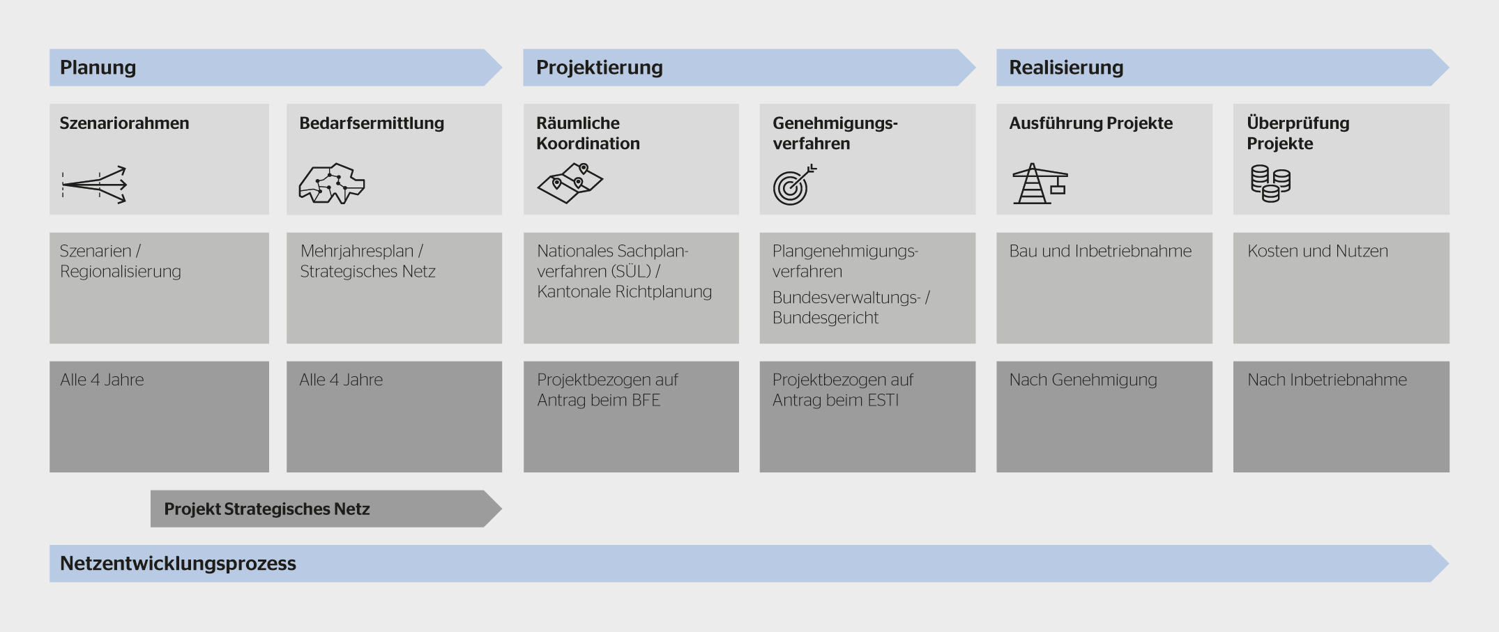 Deshalb erstellt Swissgrid periodisch einen Mehrjahresplan: das Strategische Netz. Es zeigt auf, wie sich das Übertragungsnetz bis im Zieljahr entwickeln sollte und welche zusätzlichen Netzprojekte nötig sind, um den künftigen Anforderungen zu entsprechen. Dieser Planungsprozess wird derzeit zum dritten Mal durchgeführt: Auf die Strategischen Netze 2015 und 2025 folgt jenes für 2040. Zum ersten Mal basiert der Prozess auf einer gesetzlichen Grundlage, die der Bund im Rahmen seiner Strategie Stromnetze geschaffen hat.