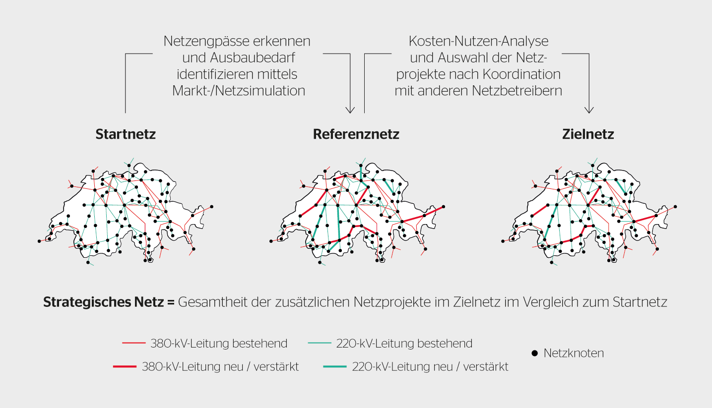 Am Ende der Regionalisierung verfügt Swissgrid über alle nötigen Informationen, um das Strategische Netz 2040 zu bilden. Dieser Netzplanungsprozess erfolgt in drei Schritten: