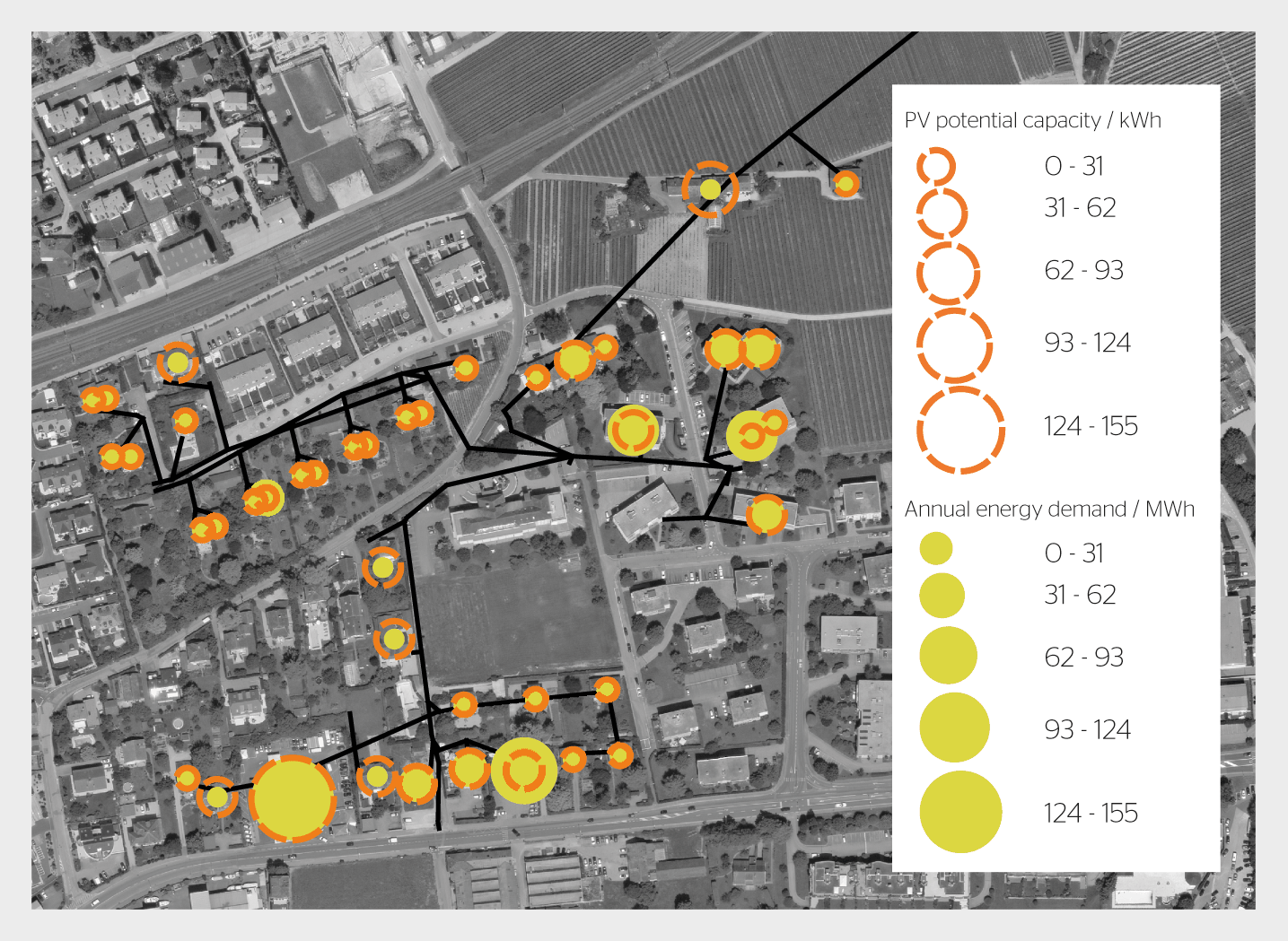 Les effets de ces tarifs ont été étudiés sur un réseau basse tension de la région de Rolle comprenant 41 bâtiments (figure 1), en considérant la courbe de charge annuelle (simulée à partir de courbes de charge mesurées sur des bâtiments similaires) ainsi que la courbe de production PV en fonction de la surface de toit disponible (déterminée à partir de toitsolaire.ch [3]). Pour chaque bâtiment, une optimisation de la somme des coûts d’investissement et d’opération permet de définir, pour chaque modèle de tarif, la taille du système PV et de la batterie ainsi que le détail de son opération.