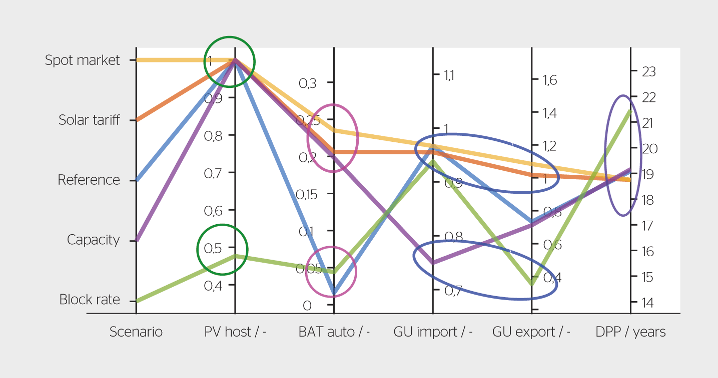 La figure 2 présente les effets des différents tarifs («scenario») sur le dimensionnement des systèmes. Ils peuvent exercer une influence sur le taux de couverture PV du toit («PV host»), la part de la consommation journalière moyenne du bâtiment qui peut être couverte par la batterie («BAT auto»), l’utilisation du réseau («grid use, GU») pour l’achat («import») et la reprise («export») et le retour sur investissement actualisé («discounted payback period, DPP», en années). À noter encore que la composante «GU import» correspond au rapport de la puissance maximale résiduelle à l’achat (soit la charge du bâtiment à laquelle sont soustraites la production PV et la décharge de la batterie) et de la puissance maximale de la charge du bâtiment (avant installation de la batterie ou du système PV). La composante «GU export» correspond, quant à elle, au rapport de la puissance maximale résiduelle à la vente (soit la production PV à laquelle sont soustraites la charge du bâtiment et la charge de la batterie) et de la puissance maximale de la charge du bâtiment.