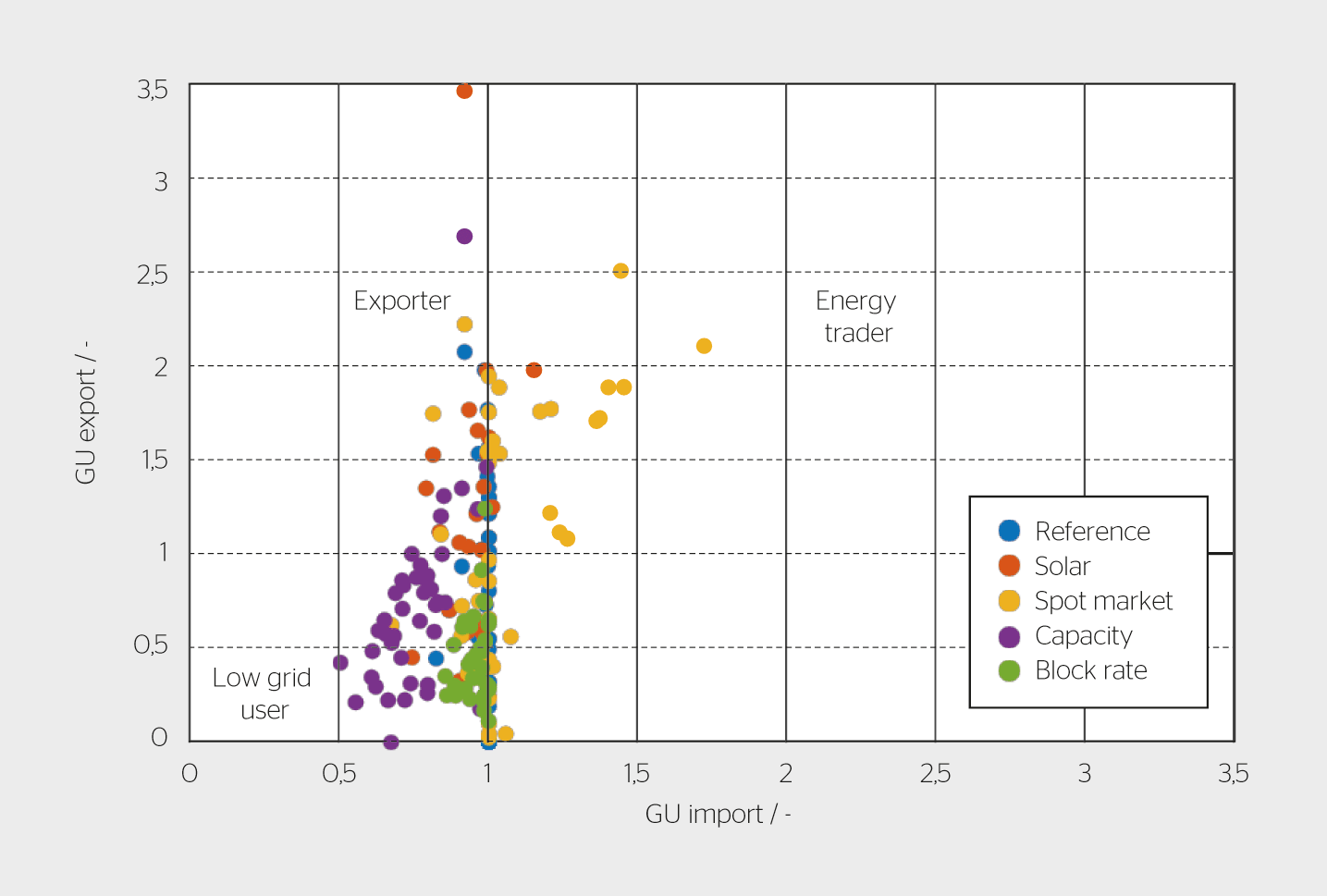 Les tarifs promeuvent différents comportements des systèmes que l’on peut ainsi classifier entre les catégories «utilisateurs légers» qui vont maximaliser leur autoconsommation, «exportateurs» qui vont vendre leurs excédents PV, et «négociants en énergie» qui vont multiplier les échanges. Il est à noter que la figure 3 ne reflète que les maximums de puissance et non les échanges d’énergie. Toutefois, ces effets des différents modèles de tarification sont aussi observés sur les courbes de durée de charge présentées dans [2], qui valident cette classification des systèmes. On retrouve aussi les mêmes tendances si l’on s’intéresse aux surtensions induites dans le réseau.[2] Ici aussi, les tarifs «capacity» ou «block rate» réduisent l’apparition de surtensions.