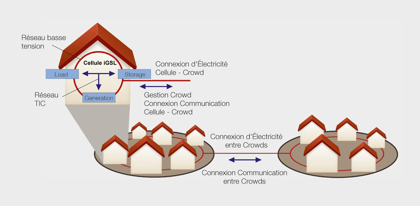 Crowd Energy se base sur des systèmes de consommation, de production et de stockage autonomes et intelligents (figure 2). Une cellule iGSL (intelligent Generation, Storage, Load) est la plus petite entité et peut, par exemple, représenter une habitation. Crowd Energy signifie que ces cellules individuelles coopèrent les unes avec les autres, en échangeant informations et électricité. Le principe production-consommation local généré définit la distribution entre les cellules avec un surplus ou un déficit.