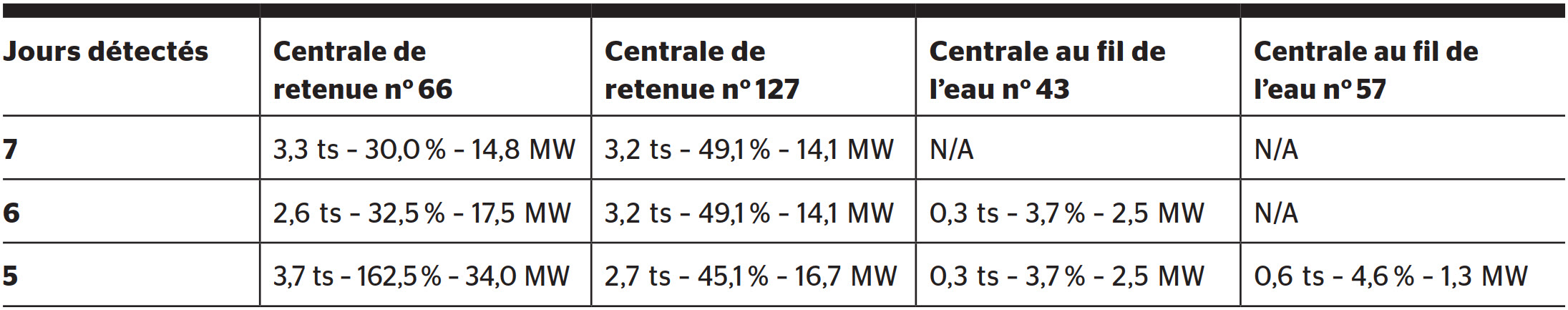 Les mesures de performance des algorithmes développés au cours de ce projet sont présentées pour des cyberattaques de distorsion et de rediffusion dans les tableaux 1 et 2 respectivement. Les performances sont mesurées en fonction du nombre d’anomalies détectées, du temps moyen nécessaire pour les détecter (en nombre de pas de temps, indiqué par «ts» pour «time step») ainsi que des déviations absolue et relative (en pourcent) entre les puissances réelle et annoncée au moment de la détection. Des quatre centrales de production considérées, deux sont des centrales de retenue (no 66 et 127), et deux des centrales au fil de l’eau (no 43 et 57).