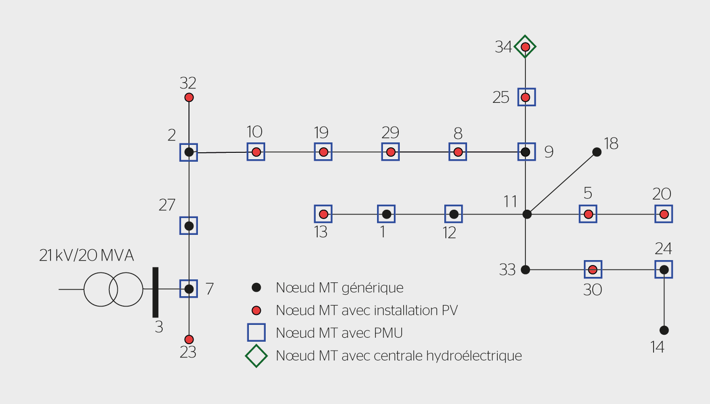 Pour la mise en œuvre de ces développements, les chercheurs ont retenu le réseau de distribution MT d’Aigle, dans lequel est injectée une importante production à base d’énergies renouvelables stochastiques dont la puissance de crête est égale, ou supérieure, à la consommation locale. Ce site correspond à une zone mixte rurale/urbaine typique. Le réseau électrique est composé d’un feeder d’une tension nominale de 21 kV, exploité avec une topologie radiale composée de 24 nœuds (figure 1). Le feeder intègre une capacité de production photovoltaïque totale de 3,2 MW, incluant une centrale photovoltaïque de 1,8 MW et diverses installations PV dispersées de plus petites tailles. En outre, le feeder intègre aussi un total de 3,4 MVA de production hydroélectrique provenant de quatre centrales. La consommation électrique peut atteindre 4,3 MW en hiver et 2,9 MW en été.