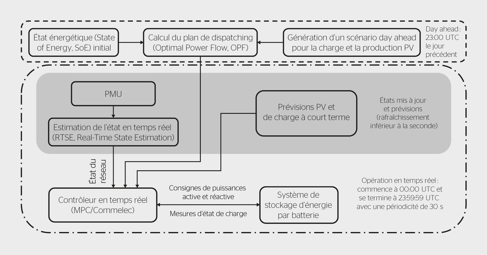Dans la phase en temps réel, deux approches (MPC et Commelec) sont utilisées pour calculer les valeurs de consigne des puissances active et réactive du système de stockage d’énergie de manière à suivre le plan de dispatching au point de connexion au réseau, tout en respectant les contraintes autant du système de stockage d’énergie par batterie que du réseau. D’une part, la commande prédictive MPC cherche à minimiser l’erreur du dispatching sur un horizon temporel de 5 min (la commande est actionnée toutes les 30 s) en exploitant les prévisions à court terme. D’autre part, le système Commelec résout un OPF approximé à un taux de rafraîchissement inférieur à la seconde à l’aide d’un algorithme du gradient (gradient-descent-based algorithm) efficace en termes de volume de calcul. Les opérations en temps réel commencent à 00:00 UTC et se terminent à 23:59:59 UTC.