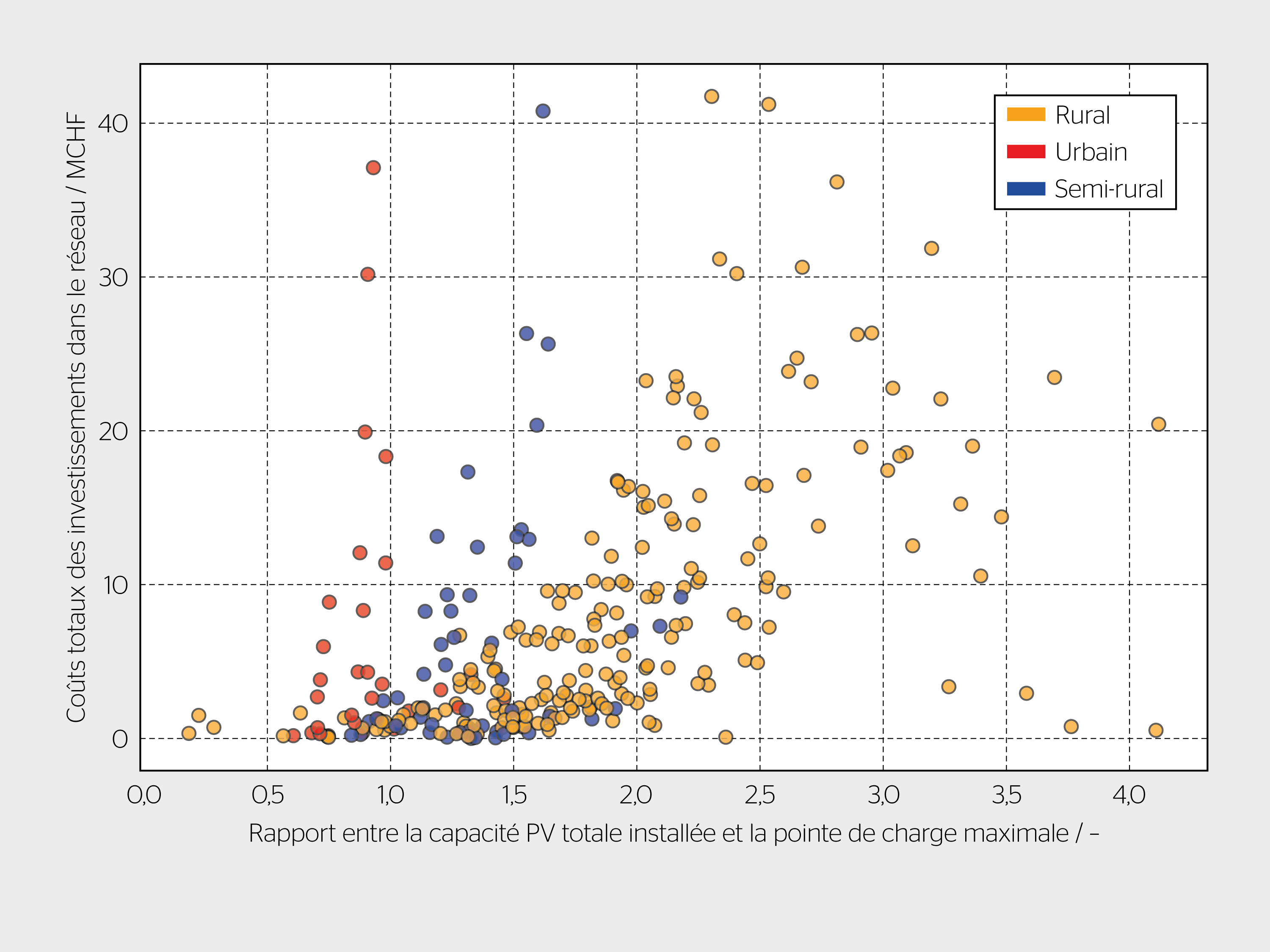 La figure 2 présente les coûts d’investissement totaux pour une planification traditionnelle ainsi que le rapport correspondant entre la capacité PV totale installée et la demande maximale en 2030, 2035 et 2040. Les résultats montrent une forte corrélation entre les coûts d’investissement et le taux de pénétration du photovoltaïque dans les régions rurales (représentées en orange), tout comme dans certaines régions semi-urbaines (bleu foncé). Cela montre que le développement du PV dans ces régions est le principal moteur des coûts d’investissement lorsque des pratiques de planification traditionnelles sont appliquées. Dans les réseaux des régions urbaines (rouge) où le taux de pénétration du PV est plus faible, l’électrification de la demande pour les PAC ou pour la mobilité (recharge des VE) a une influence plus importante sur les coûts d’investissement. L’hétérogénéité des réseaux ressort clairement de l’analyse, non seulement entre les différents types de régions, mais aussi entre les réseaux d’un même type de région.
