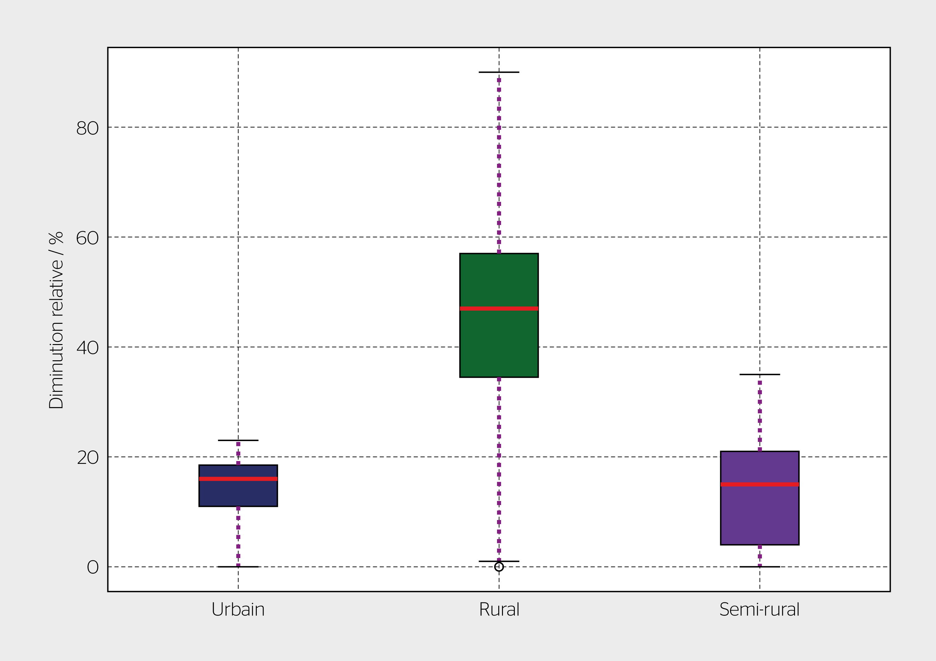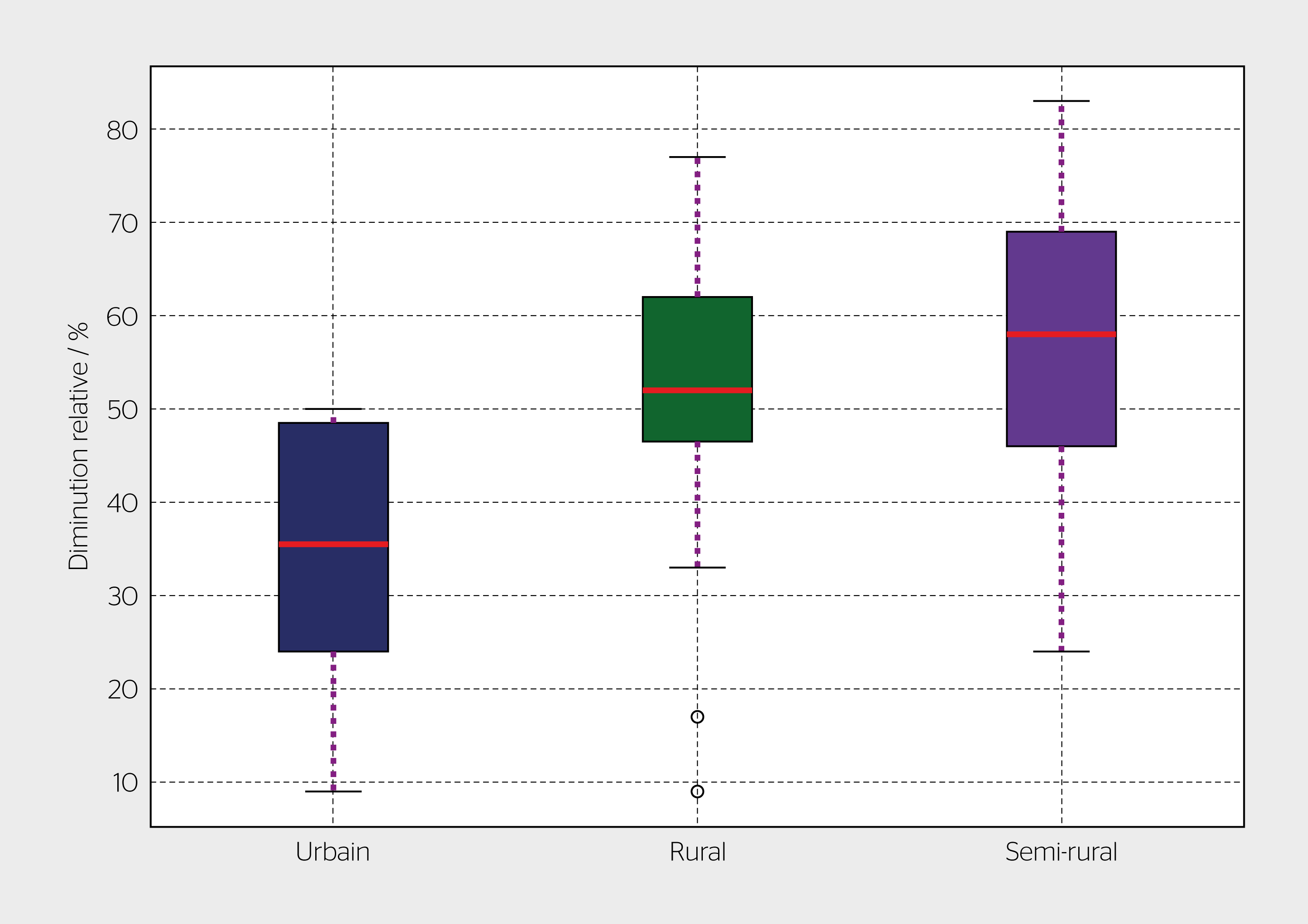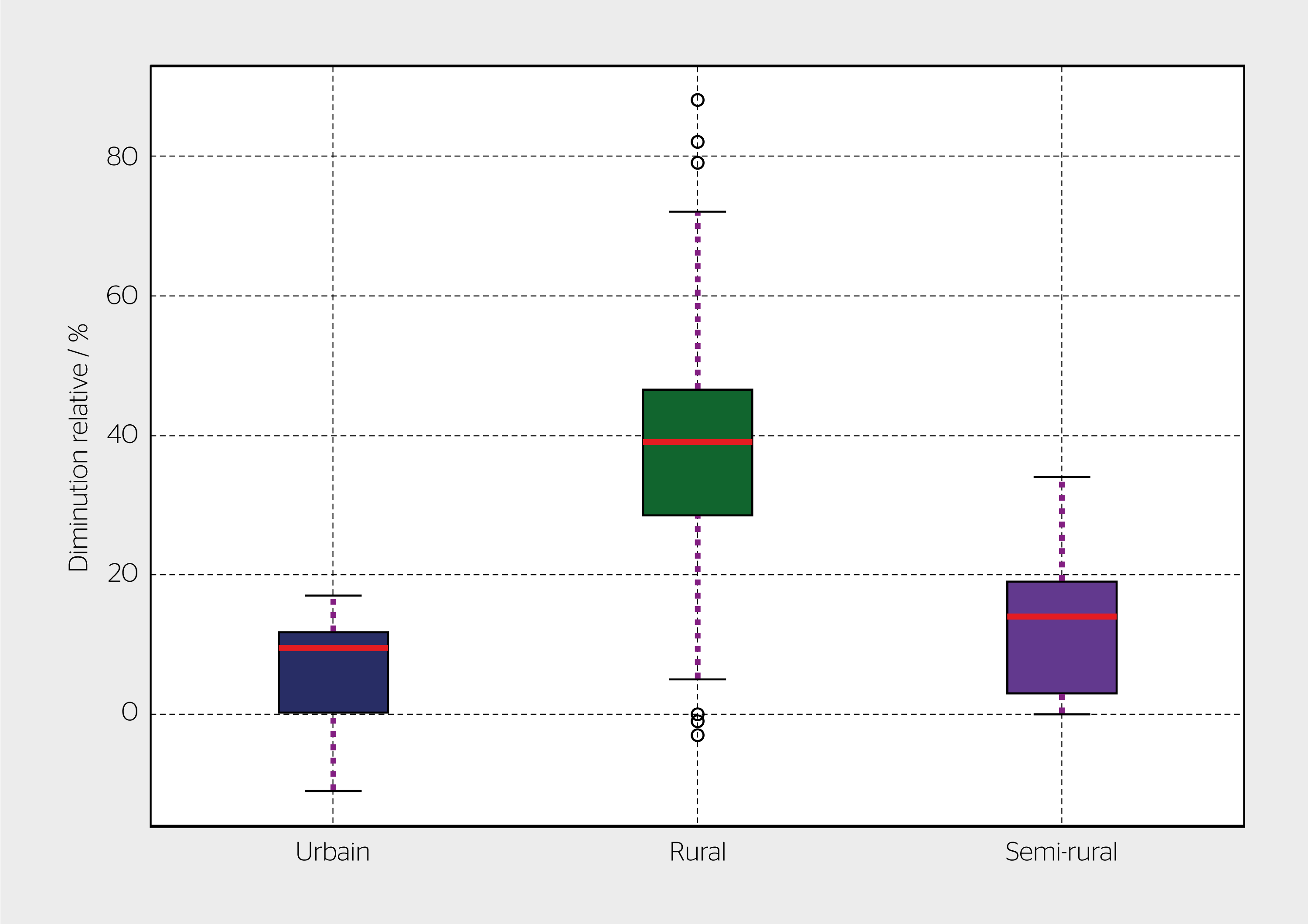 Les résultats de la figure 3 montrent la diminution relative des investissements totaux dans le réseau en 2040 lorsque la flexibilité PV est utilisée en limitant la production PV à 70% de la production maximale par rapport à la planification traditionnelle. Les résultats sont présentés sous la forme de boîtes à moustaches pour illustrer l’hétérogénéité des réseaux étudiés. Il est à noter que la valeur médiane de réduction des investissements réseau totaux en 2040 en limitant le PV est de 52% dans les régions rurales étudiées, alors qu’elle est de 36% dans les régions urbaines et de 58% dans les régions semi-rurales.