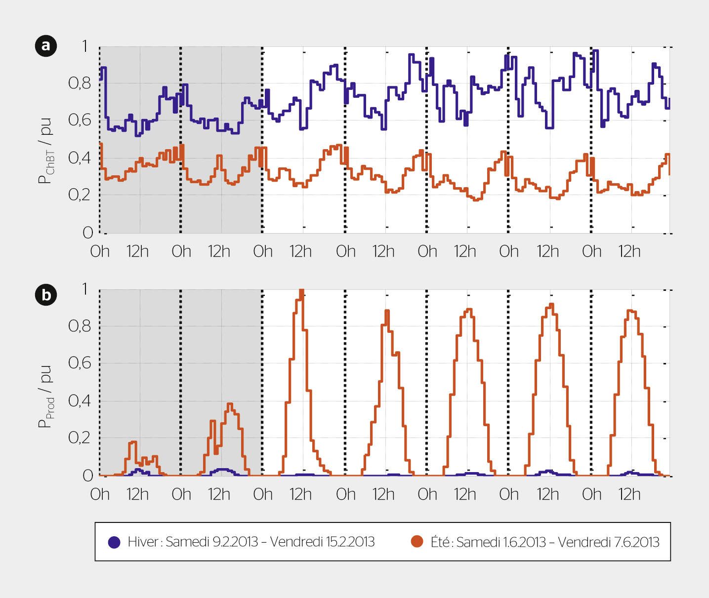 Sur la base des différentes caractéristiques et modèles réalistes établis, ainsi qu’en considérant les contraintes imposées par les normes en vigueur, différents scénarii et simulations ont été réalisés. De ces simulations, les futurs besoins possibles du réseau ont été déterminés. Les périodes «extrêmes» de l’année ont été prises en considération, à savoir: les périodes où la production est maximale tandis que la consommation est minimale et inversement (figure 2).
