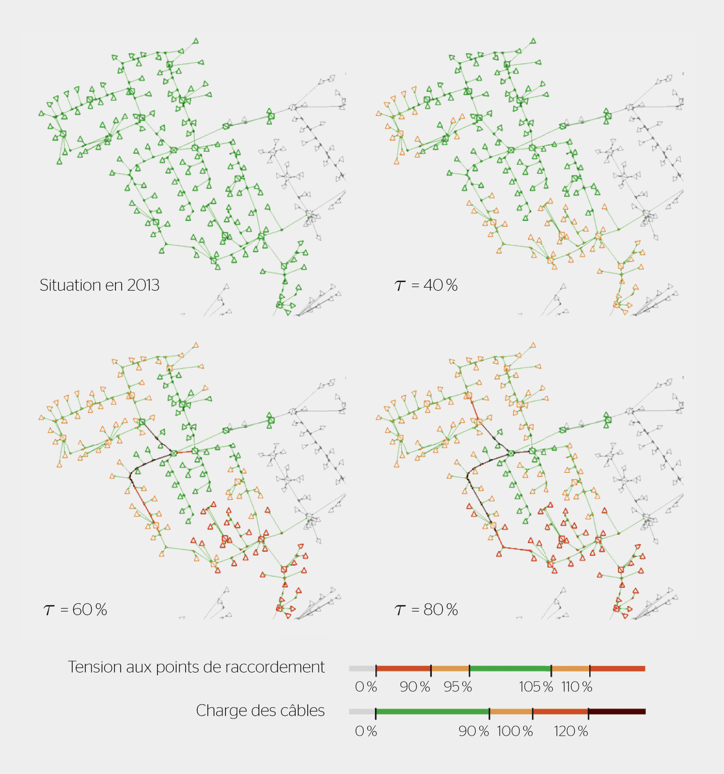 La figure 3 représente les impacts sur l’état du réseau pour les différentes puissances PV installées considérées. Le facteur de potentiel τ permet l’ajustement de la puissance installée de chaque maison par rapport à la puissance maximale des toits théoriquement retenue (en prenant en compte les surfaces des bâtiments). Dans un scénario présentant une puissance installée de production correspondant à 40% de la puissance maximale possible, on constate très clairement que la réglementation DACHCZ [2] est déjà presque constamment enfreinte. La variation de tension permise par la norme, elle, est dépassée pour une partie des clients raccordés à partir d’une puissance installée de 60%. Le même constat peut être fait concernant l’état de charge des câbles souterrains. En effet, d’importantes congestions apparaissent lorsque la production PV dépasse la consommation locale.