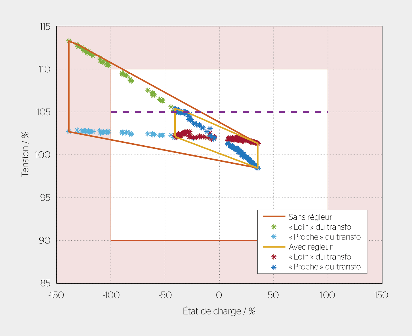 Dans des conditions d’exploitation normales du réseau et comme indiqué dans le «Distribution Code Suisse» [1], le GRD met à disposition des consommateurs finaux (point de fourniture) raccordés aux réseaux de distribution régionaux et locaux (NR5 et NR7) une qualité de tension conforme à la norme EN 50160. Cela signifie qu’en conditions normales d’exploitation et en excluant les périodes d’interruptions, il convient que les variations de tension ne dépassent pas ± 10% de la tension nominale Un. De plus, dans le cas notamment de raccordements de nouvelles IPD, le GRD veille à respecter les règles DACHCZ. Celles-ci sont beaucoup plus restrictives que la norme précédemment mentionnée et stipulent notamment que les augmentations de tensions relatives dues aux IPD n’excèdent pas les 3% au point de raccordement BT.