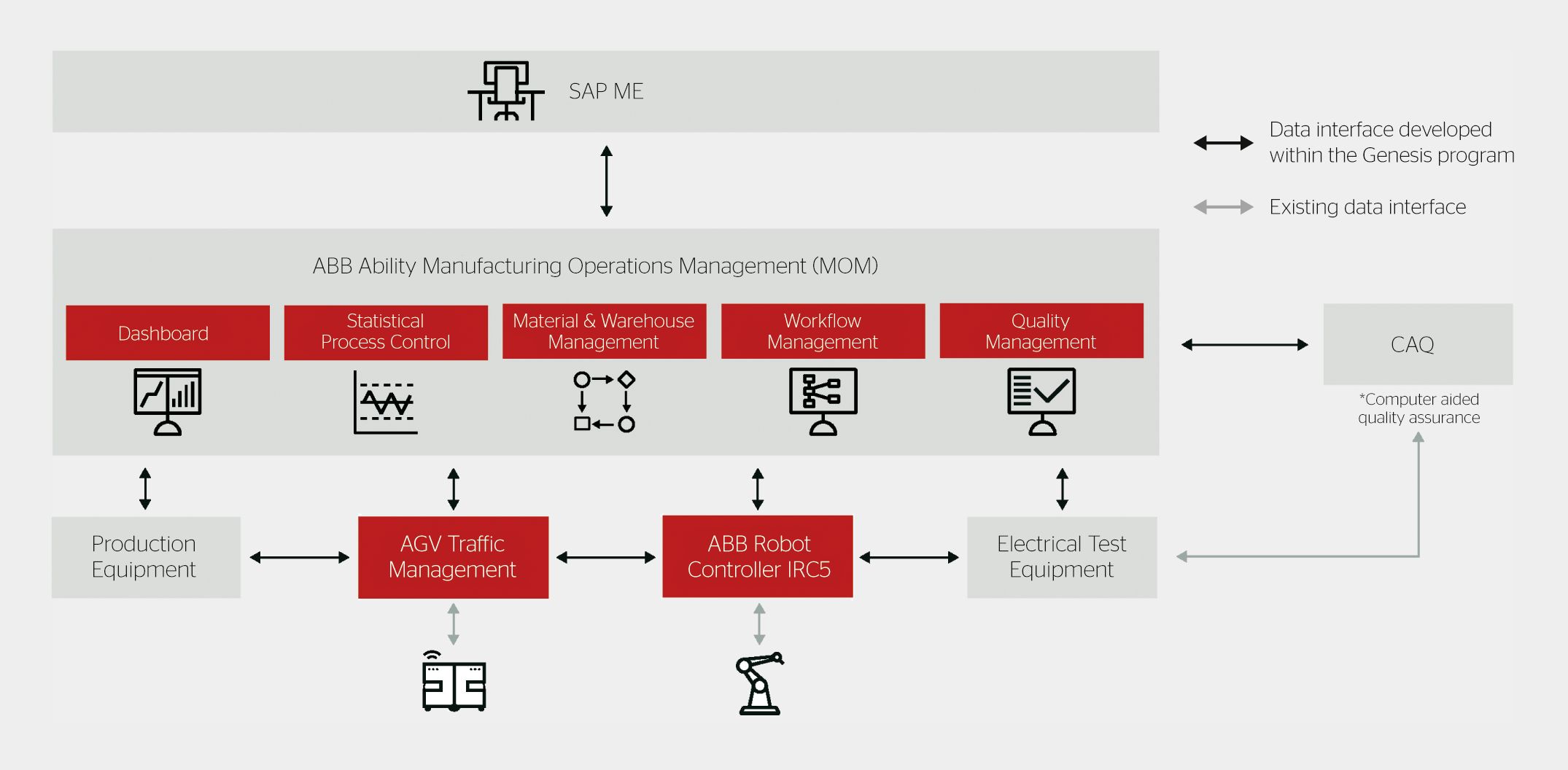 L’utilisation des AGV a ouvert la voie à des possibilités insoupçonnées et s’est révélée tout aussi importante que les robots industriels pour la réalisation d’une automatisation industrielle flexible. Toutefois, une production aussi complexe nécessitait un système centralisé pour la gestion des flux de matériel et la communication des informations indispensables aux machines. Une fois le concept complètement élaboré, commença la recherche de fournisseurs appropriés pour les machines spécialisées, les systèmes MES et les AGV. Capable d’intégrer verticalement l’ensemble des quelque 120 machines différentes, le MES (Manufacturing Execution System) «ABB Ability MOM» s’est avéré être le système de commande centralisée le mieux adapté aux besoins du programme. Aucune entreprise générale n’ayant pu être trouvée pour prendre la tête de l’intégration, ABB a décidé de s’en charger elle-même.