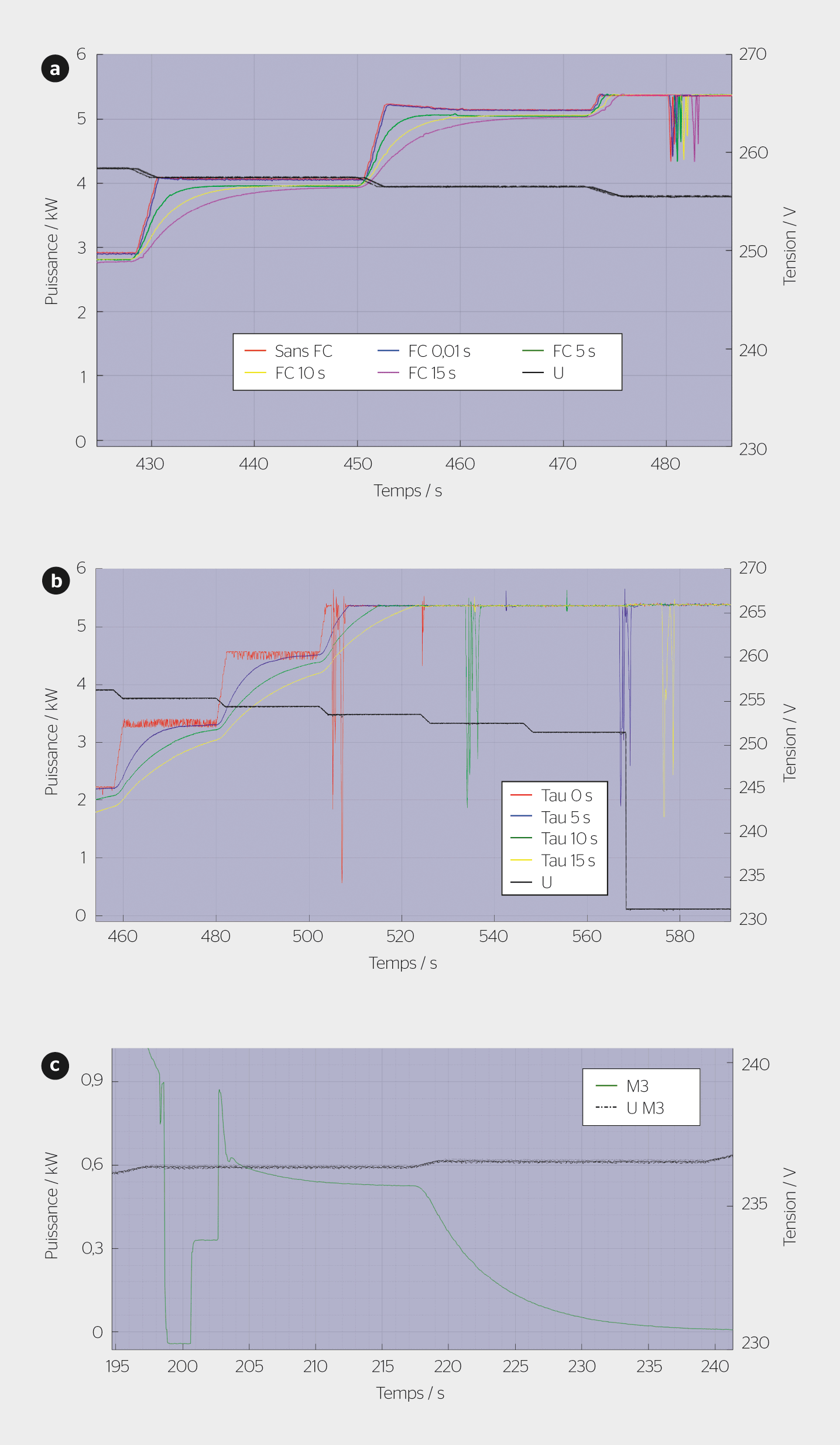 Les mesures montrent que même avec des gradients élevés (jusqu’à plus de 400%/V) ainsi qu’avec la minimisation des temps pour les filtres de valeur de consigne et des constantes de temps proches de zéro, il n’y a pas d’instabilité qui s’installe à long terme. Les onduleurs peuvent garantir une stabilité satisfaisante par une limitation des variations et une conception robuste du régulateur. Un appareil mesuré oscille légèrement autour de la valeur attendue avec une faible amplitude, à condition que les autres onduleurs régulent également activement. Il est rare que l’on constate une influence mutuelle qui, dans le pire des cas, pourrait provoquer une bistabilité temporaire avant que la puissance correcte ne soit réglée. Outre les fluctuations à court terme décrites, qui semblent largement indépendantes des réglages, de légères oscillations ou des dépassements ont pu être constatés de manière isolée en raison de réglages extrêmes non pertinents pour la pratique. Les observations décrites lors des mesures en laboratoire sont représentées à titre d’exemples dans la figure 4.
