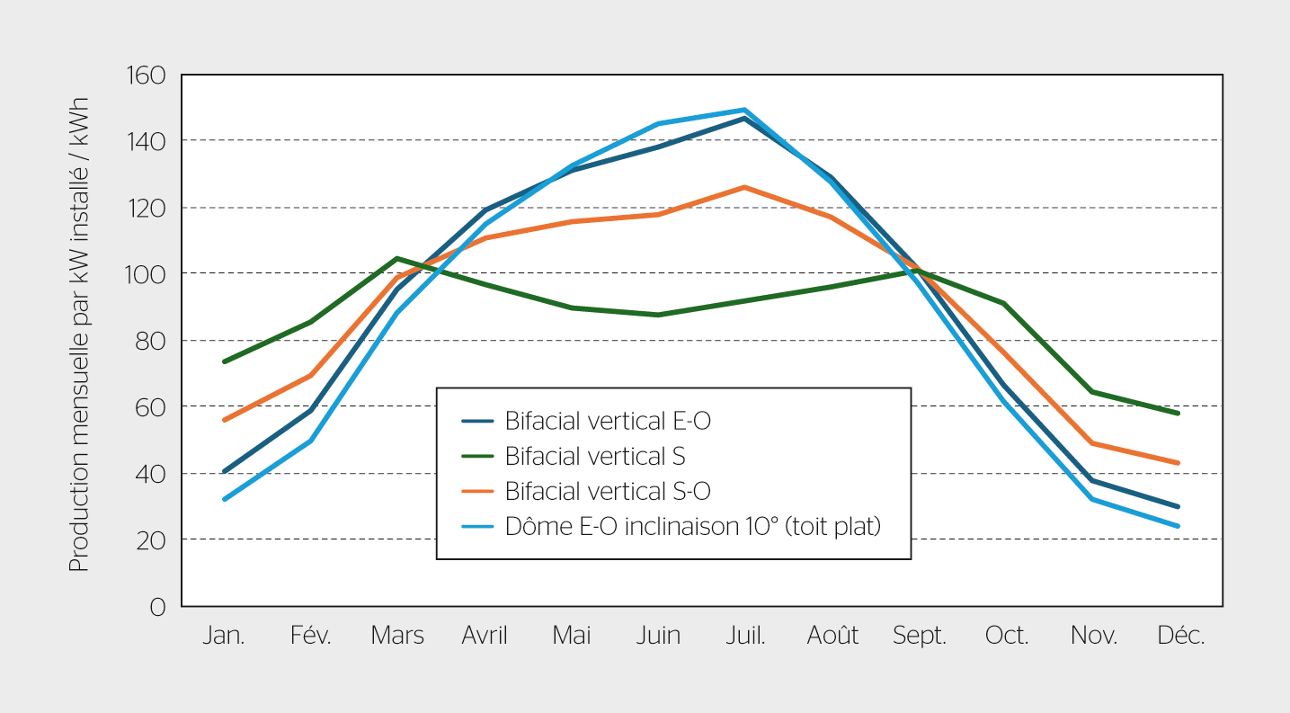 Ensuite, si les productibles annuels du PV bifacial vertical et du PV incliné conventionnel sont plus ou moins égaux, leurs courbes de production peuvent être très complémentaires (figures 1 et 2). Le bifacial vertical peut produire dans les moments de la journée ou de l’année où la demande et le prix d’achat sont généralement plus élevés. Les diverses orientations du bifacial vertical présentent néanmoins toutes des avantages et des inconvénients. Il est donc nécessaire de tenir compte à la fois des courbes de productions journalières et annuelles pour choisir l’option et l’orientation la mieux adaptée aux besoins spécifiques d’un projet. Par exemple, un parfait vertical est-ouest aura l’avantage de bien produire en début et en fin de journée, mais l’inconvénient de produire relativement peu en hiver. Les orientations verticales sud-est (S-E) ou sud-ouest (S-O) constituent, quant à elles, un bon compromis pour éviter le pic de production de la mi-journée tout en obtenant un productible hivernal élevé.