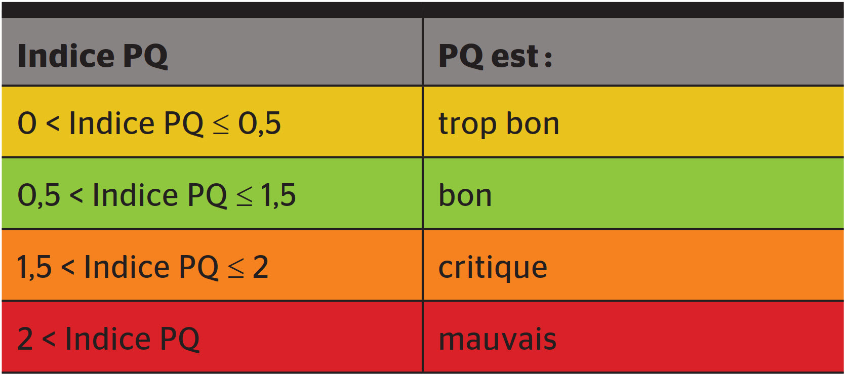 Les valeurs des paramètres PQ sont réparties dans le système de référence sur un intervalle de 0 à 2 – 0 correspondant à la valeur nominale, 1 à la valeur moyenne et 2 à la valeur limite. L’indice PQ se compose de trois sous-indices: PQAvg, PQMax et PQ99. Le sous-indice PQAvg correspond à la moyenne arithmétique de tous les paramètres PQ référencés et décrit la qualité moyenne de la tension. PQMax représente le plus mauvais paramètre PQ et permet ainsi de détecter les dépassements de valeurs limites. Le sous-indice PQ99 est une combinaison de PQAvg et PQMax. Dans ce sous-indice, certaines valeurs aberrantes des paramètres PQ sont fortement mises en évidence, tandis que de faibles variations des paramètres PQ sont certes indiquées, mais pas surestimées. La figure 2 et la figure 3 présentent le calcul et les valeurs seuils de l’indice PQ. La méthodologie développée est une première mise en œuvre de l’approche. Elle sera retravaillée dans le nouveau projet QuVert à l’aide de réflexions et de données de mesure supplémentaires [6].
