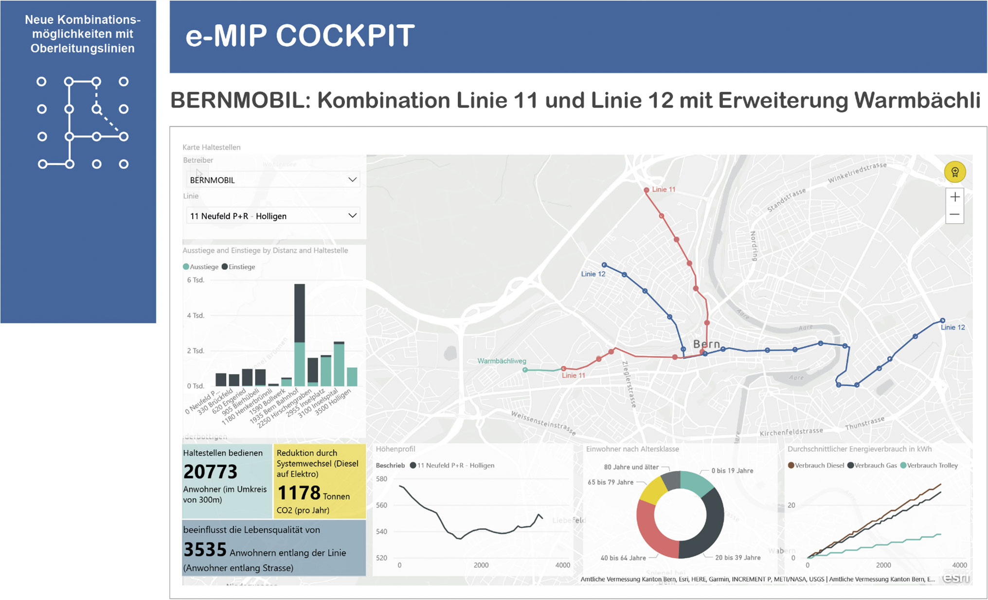 L’e-MIP (electro-Mobility Information Planning) tool, développé par la BFH en partenariat avec Carrosserie Hess, offre une approche permettant de flexibiliser les réseaux de bus. L’outil associe la mobilité électrique dans les transports publics à la nécessité d’une meilleure qualité de vie et à la réduction des émissions dans les zones urbaines. L’objectif consiste à réduire les émissions de CO2 par rapport aux systèmes d’entraînement conventionnels tels que ceux des bus diesel.