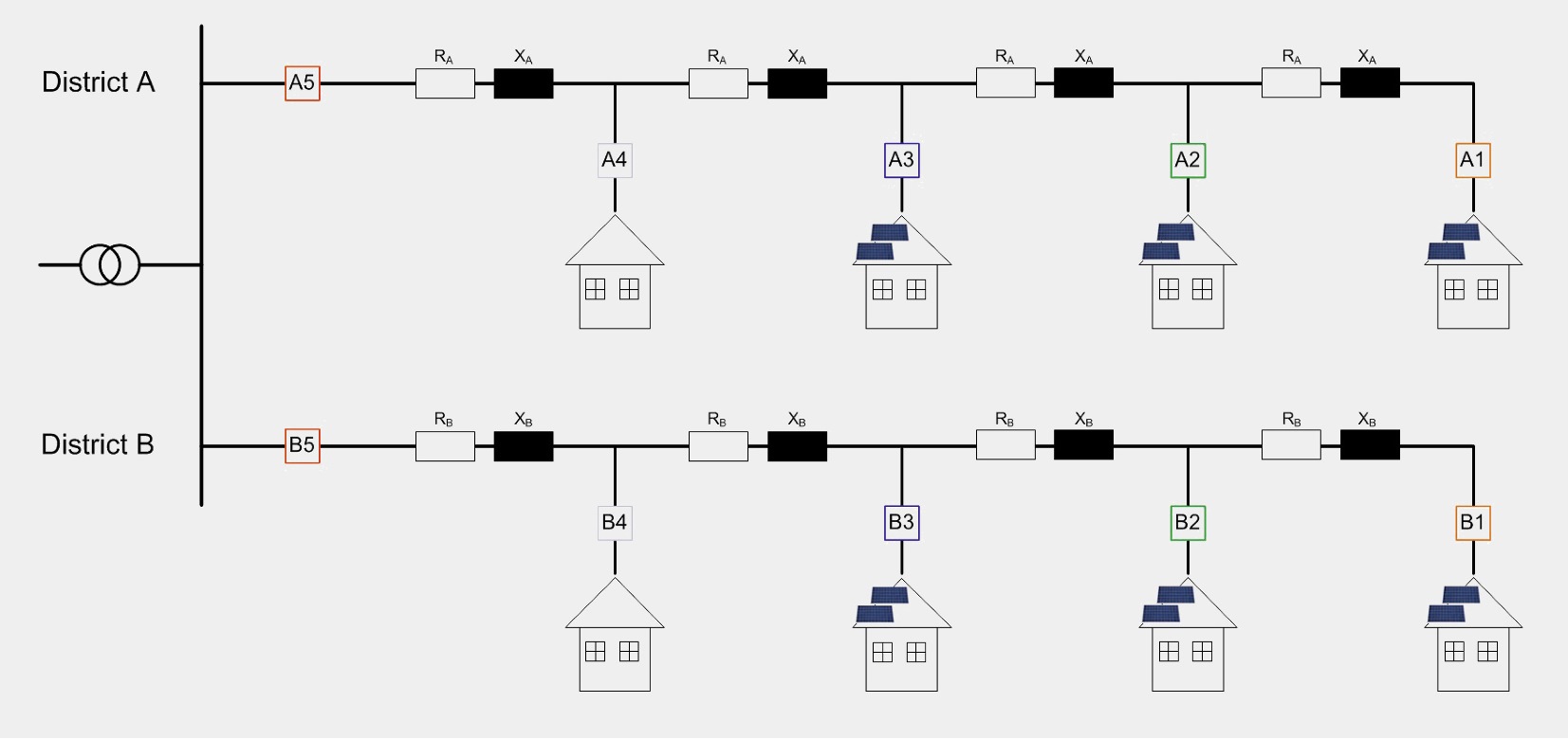 Un réseau formé de deux lignes de caractéristiques assez différentes a été choisi pour mettre en évidence une structure peu homogène, à priori plus difficile à maîtriser. La ligne «District A» est une ligne aérienne, alors que la ligne «District B» est un câble souterrain (figure 1).
