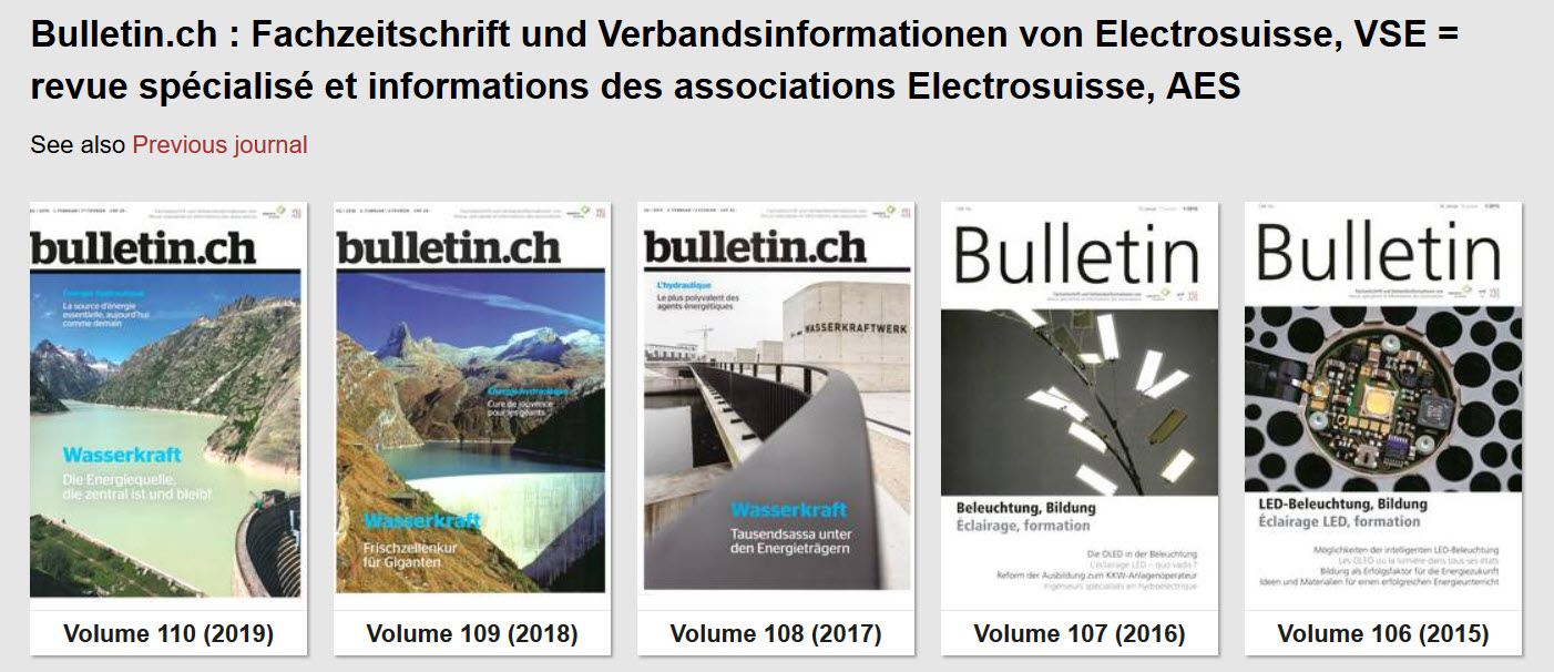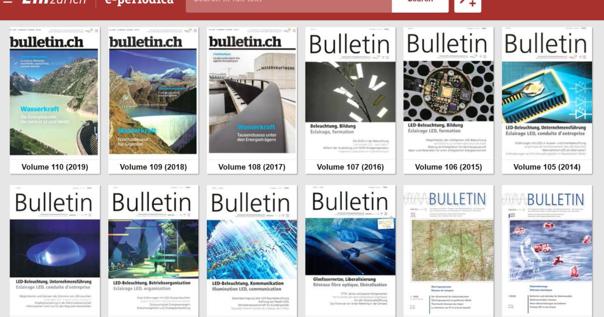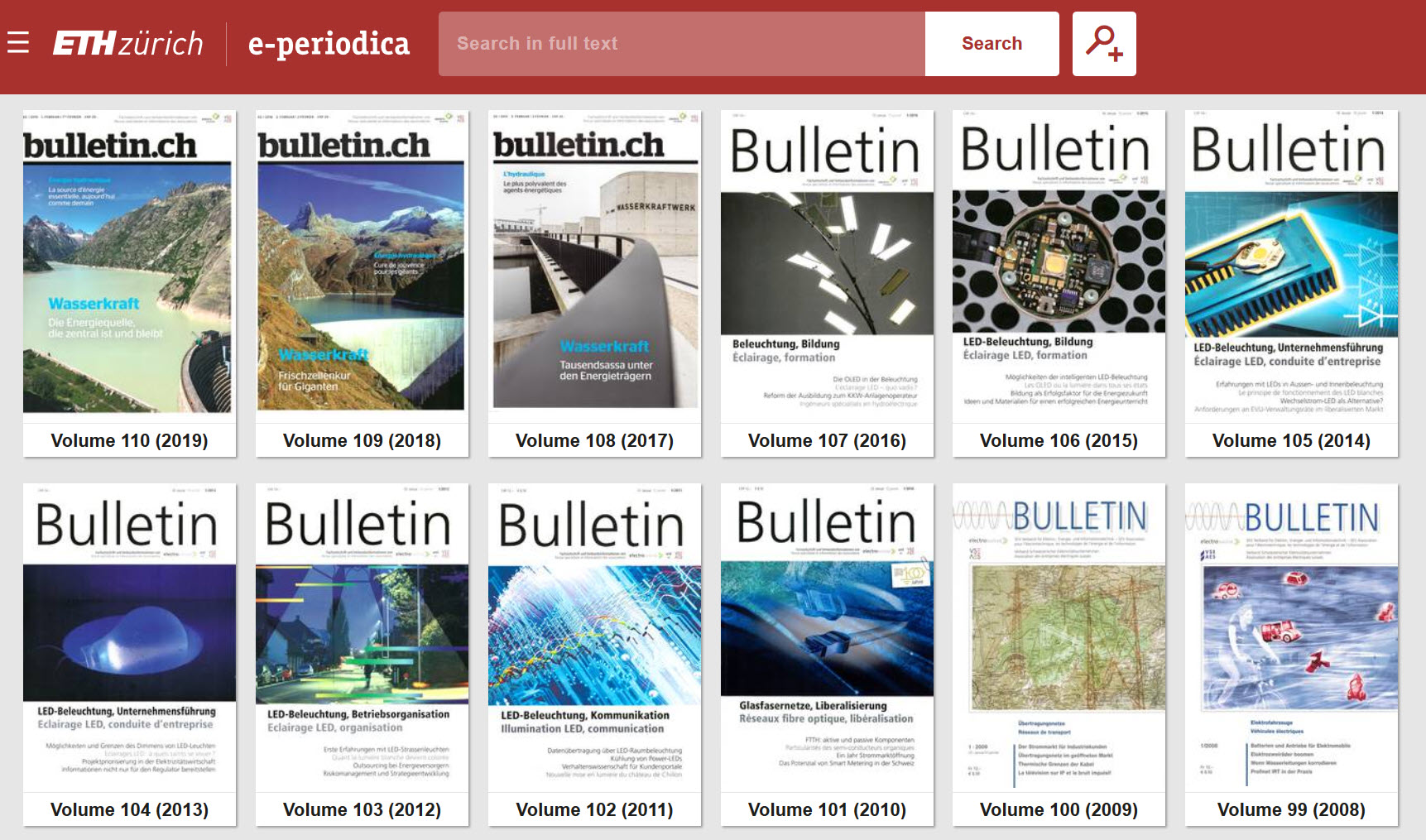 Les numéros des années 2000 à 2019 du Bulletin SEV/VSE sont désormais disponibles en ligne - triés par année - sur e-periodica. La plateforme d'archivage de la bibliothèque de l'ETHZ permet une recherche confortable de contenus au moyen d'une fonction de recherche et de tables des matières annuelles et offre, outre la lecture en ligne, la possibilité de télécharger les pages souhaitées au format pdf.