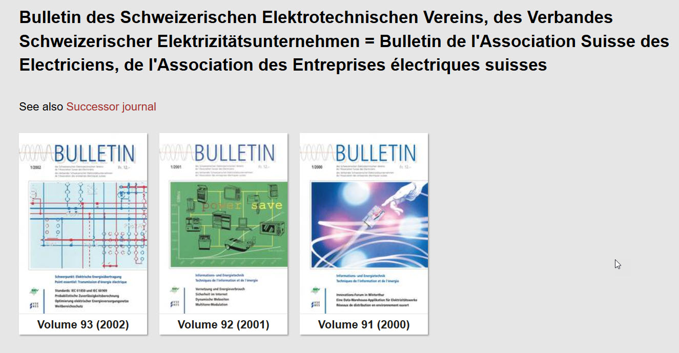 Conformément aux règles en vigueur lors de l'archivage de revues à la bibliothèque de l'ETHZ, ces décennies ont dû être scindées en deux parties, l'ancienne Association suisse des électriciens ayant été rebaptisée Electrosuisse en 2002.