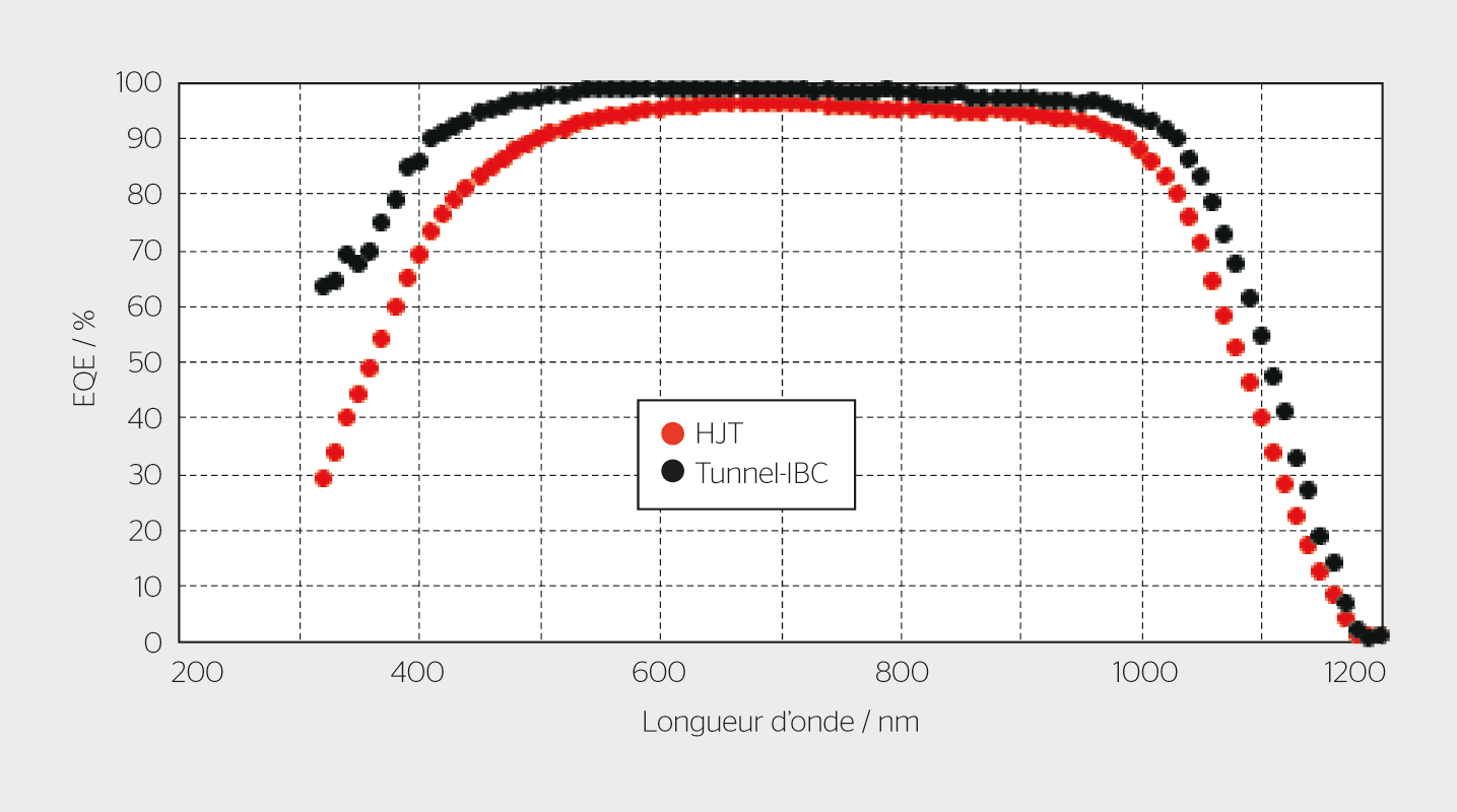 La figure 2 compare les efficacités quantiques externes (EQE) des cellules HJT et tunnel-IBC pour la gamme de longueur d’onde usuelle des photons incidents (de 300 à 1200 nm). Pour rappel, l’efficacité quantique externe correspond au rapport entre le nombre de charges électroniques collectées et le nombre de photons atteignant la cellule. Le gain de la technologie tunnel-IBC par rapport à la technologie HJT dans la partie UV-bleu-vert (de 300 à 500 nm) est clairement visible. La réflexion arrière est aussi optimisée, ce qui contribue à une meilleure génération de porteurs dans la partie infrarouge (à partir d’environ 700 nm) du spectre solaire. Ces caractéristiques permettent à la technologie tunnel-IBC d’être plus performante sur l’ensemble du spectre.