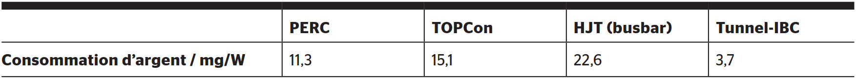 L’étude des coûts de production a permis d’optimiser le design des électrodes des cellules afin d’atteindre une consommation d’argent de 3,7 mg/W – nettement inférieure à celle des technologies existantes et concurrentes (PERC, TOPCon, HJT utilisant des busbars, voir tableau 1) –, et de réaliser ainsi des économies substantielles en production.
