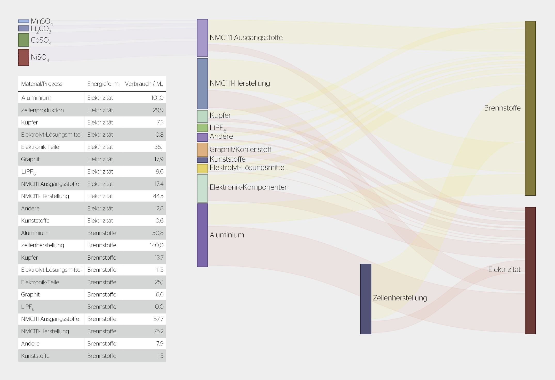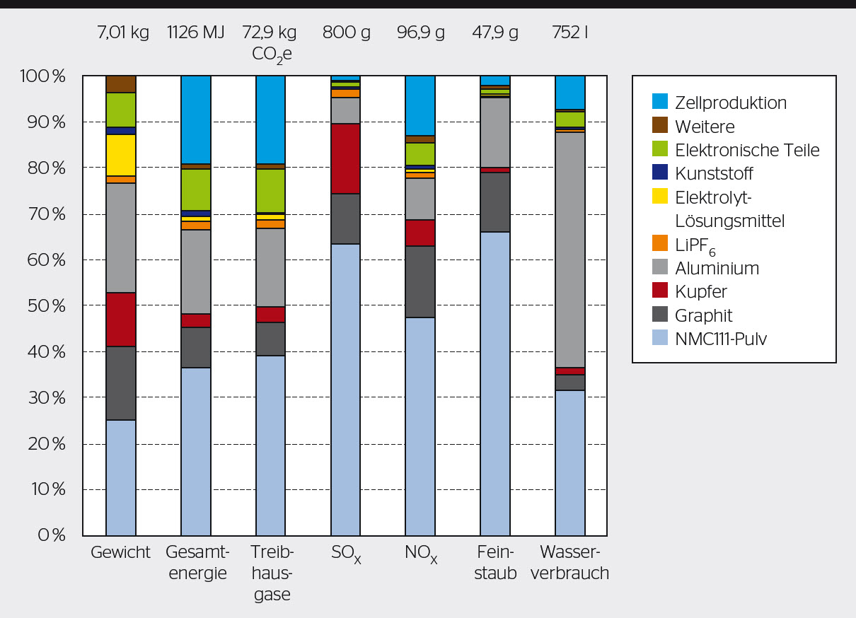 Beim Energieverbrauch dominieren zudem die Aluminiumherstellung und die Zellproduktion. Über die Hälfte des verbrauchten Wassers geht auf das Konto des Aluminiums, rund ein Drittel auf das des synthetischen Grafits.