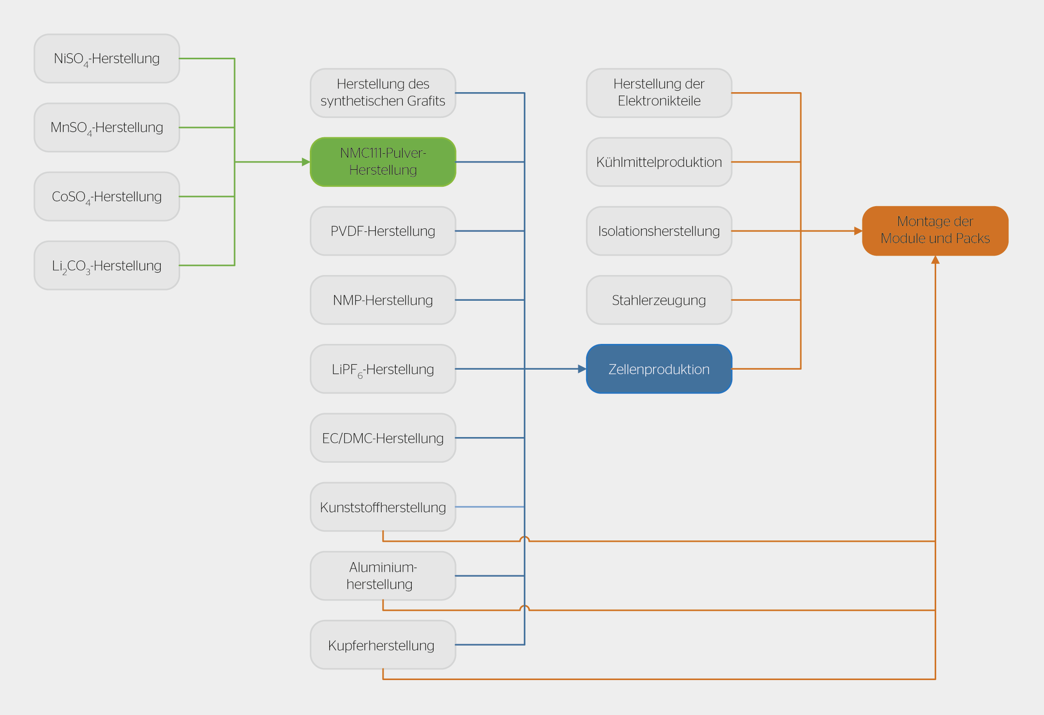 Den grössten Anteil am Gesamtenergieverbrauch der Herstellung der Batterien hat das NMC111-Pulver. Es ist verantwortlich für über einen Drittel des gesamten Energieverbrauchs und knapp 40% der Treibhausgasemissionen. Da die Rohmaterialien für die Pulverproduktion rund die Hälfte der Produktionskosten ausmachen, konzentrieren sich die Unternehmen bei der Herstellung des Pulvers deshalb auf eine maximale Materialausbeute statt auf eine möglichst hohe Energieeffizienz.