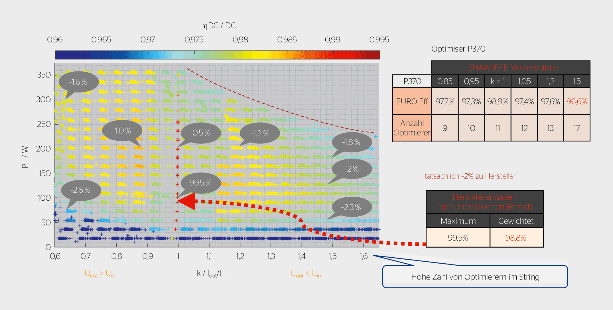 Leider geben die Hersteller der Optimierer in den Datenblättern nur die besten Wirkungsgrade von etwa 99% an, obwohl die Spannungsverhältnisse im Betrieb stark vom optimalen Verhältnis k = 1 abweichen. Dies hat das IEFE-Team der ZHAW bewogen, Wirkungsgradmessungen an kommerziellen Optimierersträngen im Indoor-Labor in Winterthur durchzuführen und die Ergebnisse zu veröffentlichen (Bild 2). Dabei wurden massive Abweichungen zu den Herstellerangaben von 2% und mehr festgestellt. Selbst so geringe Abweichungen sind wirtschaftlich relevant, da genau dieser Unterschied oft auch dem jährlichen Mehrertrag eines Optimierer-Systems gegenüber einem herkömmlichen Solarwechselrichter bei leichter Beschattung darstellt. Bisher ist die ZHAW das einzige Forschungs- bzw. Testinstitut weltweit, das diesen unabhängigen Service bietet [3].