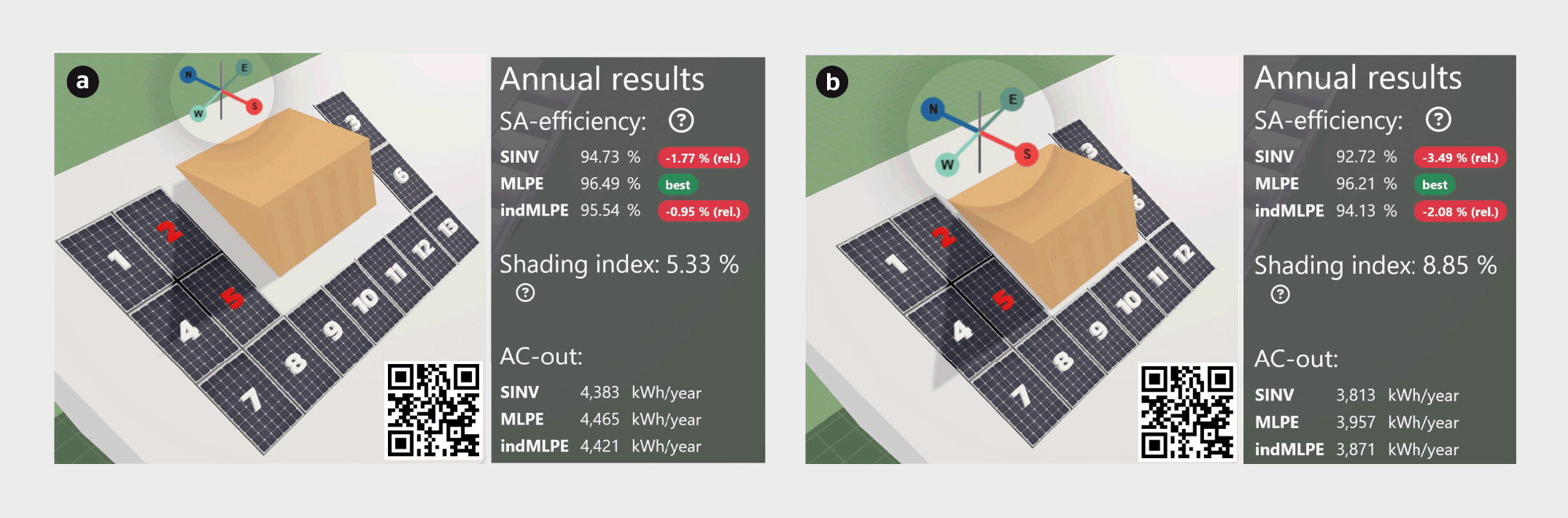 Mit einem hohen Verschattungsindex von 8,9% (geringer Abstand der PV-Module zur Gaube) hat die allMLPE-Lösung mit einem Optimierer hinter jedem PV-Modul einen Ertragsvorteil von 3,5% gegenüber der herkömmlichen Wechselrichter-Lösung.