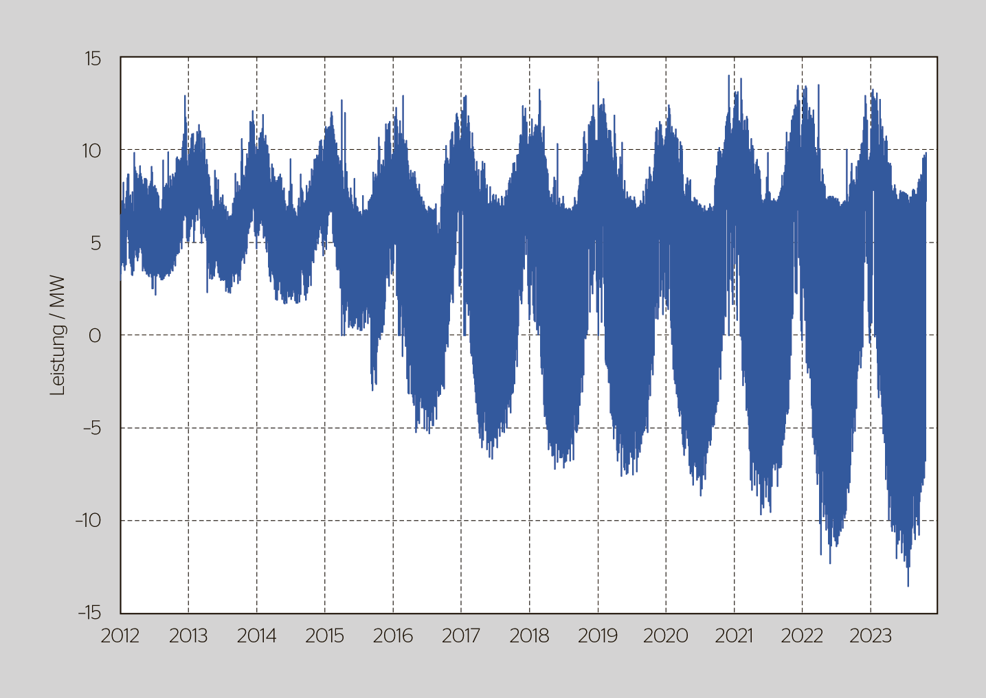 Dieses Pilotprojekt, das erste seiner Art in der Schweiz, wurde im Umspannwerk Payerne durchgeführt. Dieses versorgt über zwei 25 MVA HS/MS-Transformatoren neun MS-Netze in der Region, von denen einige eine hohe PV-Durchdringung aufweisen. Bild 1 zeigt die Entwicklung der Leistungsflüsse, die auf einem der beiden Transformatoren in den letzten zehn Jahren gemessen wurden.