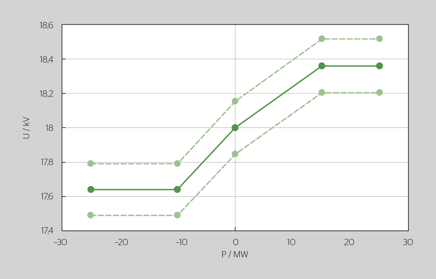 Bild 2 zeigt die U(P)-Kurve, die in den Spannungsreglern von Payerne implementiert wurde. Wenn die Stromnetze in Payerne hauptsächlich zur Versorgung von Verbrauchern dienen (geringer Anteil dezentraler Stromerzeugung), wird die Leistung, die durch den Transformator von HS zu MS fliesst, positiv gemessen (rechts im Bild). Mit dieser neuen dynamischen Spannungsregelung steigt mit zunehmendem Verbrauch die MS-Spannung im Umspannwerk Payerne bis zum definierten Maximalwert von 18,36 kV (102% der Spannung U0 = 18 kV bei Nulllast). Umgekehrt wird die MS-Spannung gesenkt, wenn der Strom von den PV-Anlagen über die MS-Netze zurück in das HS-Netz fliesst. Die Spannung wird bis zu dem durch die Kurve festgelegten Minimalwert von 17,64 kV (98% der Spannung U0 = 18 kV) gesenkt.