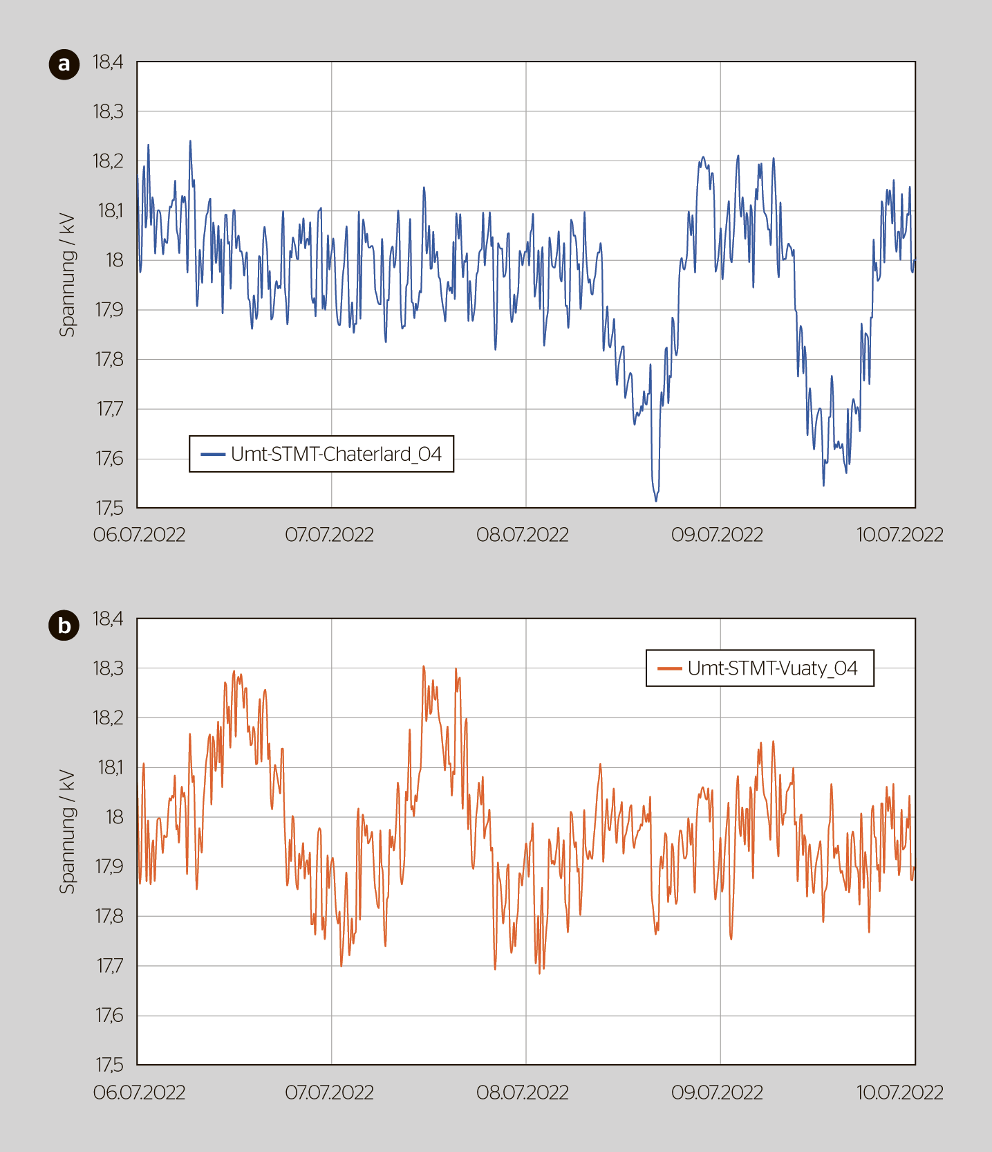 Um die Auswirkungen der dynamischen Spannungsregelung im Umspannwerk auf die MS-Netze in der Region zu validieren, wurden Messungen in verschiedenen Trafostationen entlang der MS-Leitungen durchgeführt. Bild 4 zeigt Messungen für beide Arten der Regulierung in der Trafostation Châtelard in der Nähe des Umspannwerkes und in der Trafostation Vuaty am Ende der MS-Leitung. Wie erwartet, zeigt die dynamische Regelung grössere Spannungsschwankungen am Anfang der Leitung (Bild 4a), aber diese sind vom Transformator einfach zu kontrollieren. Die positive Wirkung der neuen Regelung zeigt sich am Ende der Leitung (Bild 4b), der Stelle, die gewöhnlich Probleme mit der Aufrechterhaltung des Spannungsniveaus in ländlichen Netzen bereitet. Die Messungen zeigen, dass die Spannungsschwankungen dort mit der U(P)-Regelung stark reduziert werden.