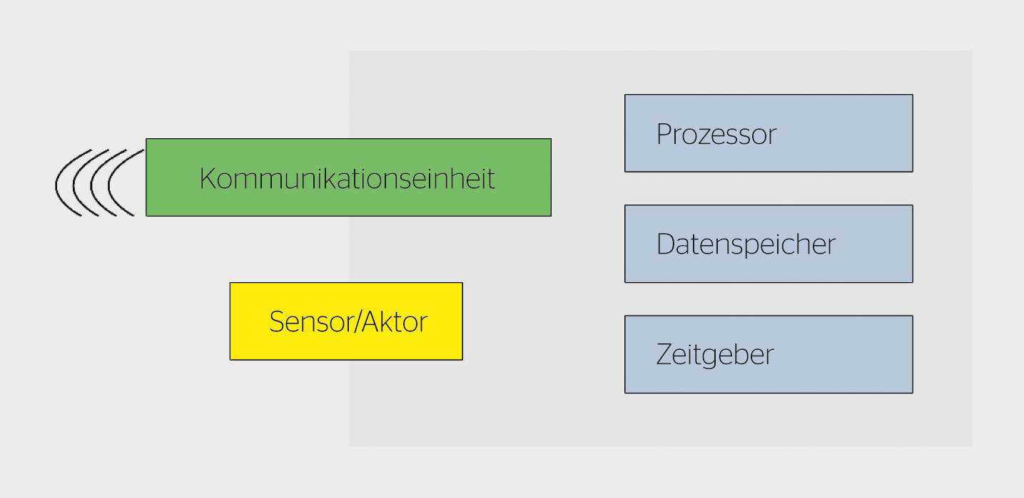Aus technischer Sicht umfasst ein IoT-Gerät einen Prozessor, einen Zeitgeber, einen Datenspeicher, eine Kommunikationseinheit und einen Sensor und/oder Aktor. Die konkrete Ausführung richtet sich nach den Anforderungen der Anwendung, etwa an die Sensorgenauigkeit, den tolerierten Jitter des Zeitgebers, die Prozessorleistung oder etwaige Maximalwerte für Volumen und Energiebedarf. IoT-Geräte werden auch als Feldknoten oder Edge Nodes bezeichnet. Über eine Netzwerkverbindung erfolgt die Kommunikation von Mess- und Steuerdaten mit der jeweiligen Anwendungssoftware. Diese kann sich vor Ort auf einem sogenannten Edge Computing Device befinden oder etwa in einem Rechenzentrum eines Cloud-Dienstes. Das IoT besteht also nicht aus einem einzigen System, sondern aus mehreren Netzwerken, die sich in Datenprotokoll, Kommunikationsweg und -geschwindigkeit teilweise signifikant unterscheiden.