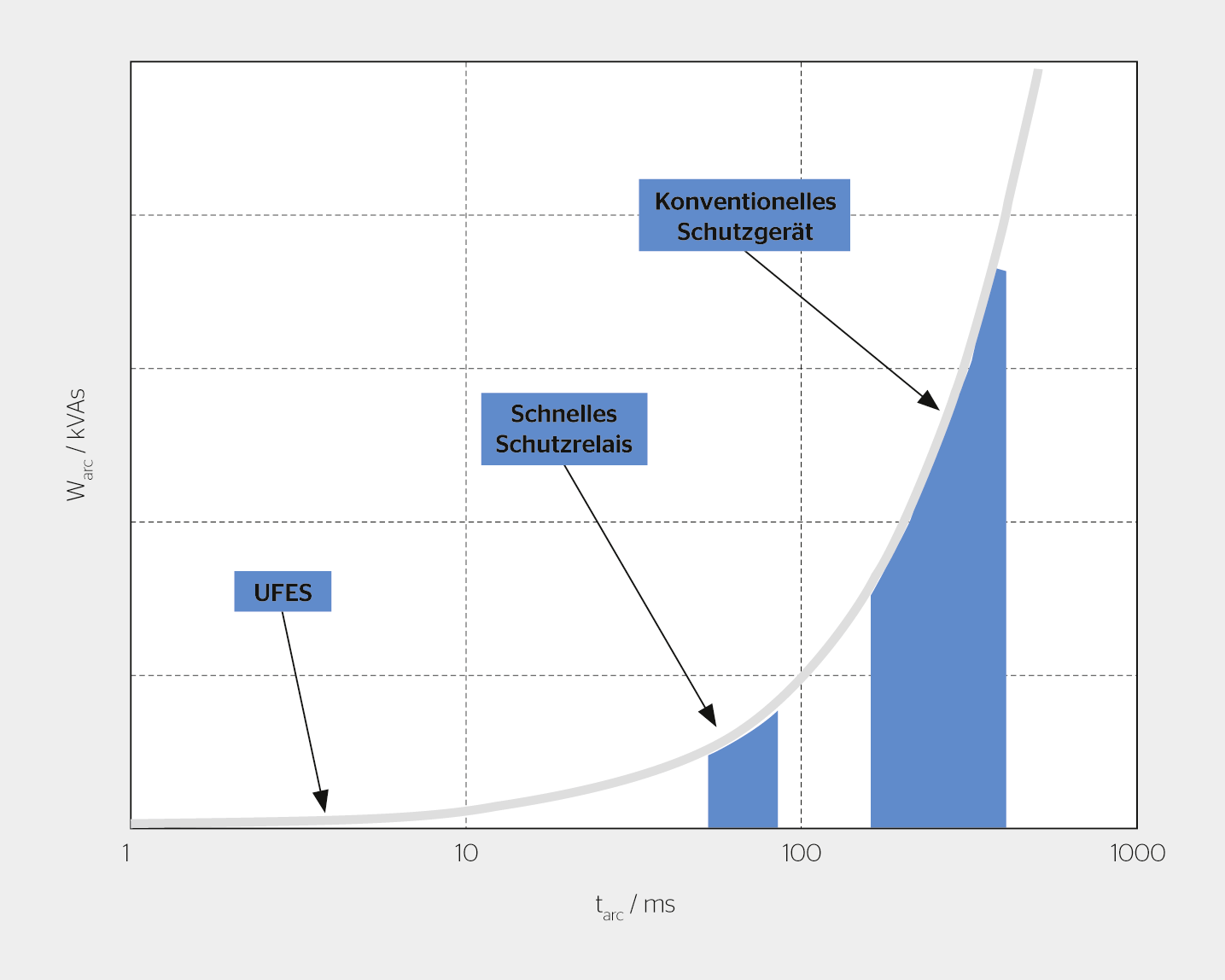 Während ein passiver Schutz im Rahmen der geprüften Störlichtbogendauer wie ein Schutzwall zwischen Fehlerort und Bedienpersonal wirkt, leiten aktive Schutzsysteme schnell Massnahmen gegen einen Störlichtbogen ein. Es gilt, die freigesetzte Lichtbogenenergie so weit wie möglich zu begrenzen. Da Fehlerstrom und Lichtbogenspannung nicht direkt beeinflusst werden können, besteht die einzige Möglichkeit darin, den Störlichtbogen so schnell wie möglich zu unterbinden.