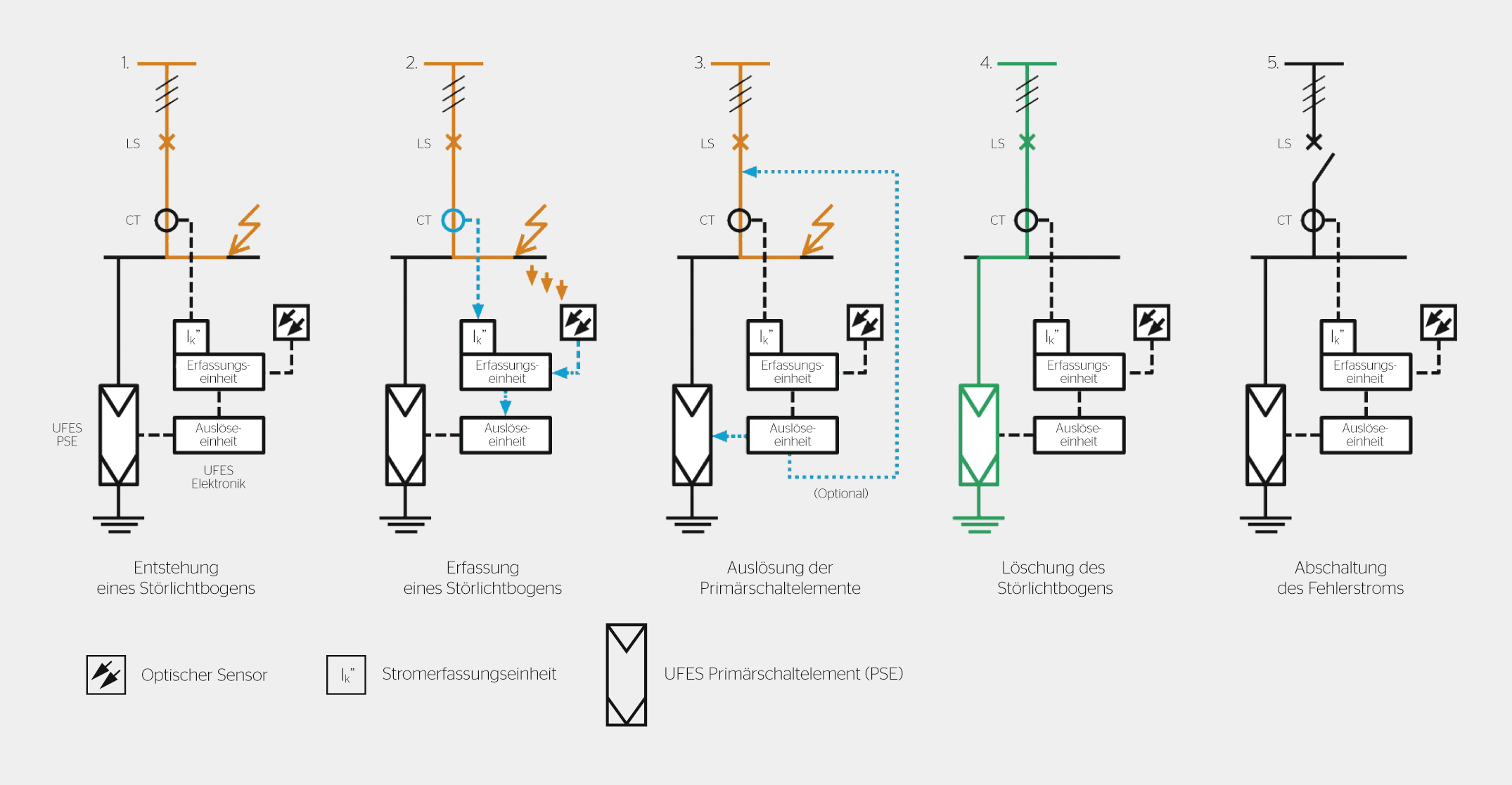 UFES vereinigt eine Gerätekombination, bestehend aus einer elektronischen Einheit sowie drei zugehörigen Primärschaltelementen (PSE), welche im Fehlerfall eine 3-phasige Kurzschlusserdung im Schutzbereich der überwachten Anlage einleiten (Bilder 1 und 3). Durch die so erzeugte niederohmigere Impedanz kommutiert der Fehlerstrom des Störlichtbogens von der Fehlerstelle auf die PSE-Kurzschlusserdung, wodurch die unkontrollierte Freisetzung von Energie durch einen Störlichtbogen effektiv verhindert wird. Die extrem kurze Schaltzeit des Primärschaltelements, in Verbindung mit der gleichermassen schnellen Erfassung des Fehlers, führt zum Verlöschen des Störlichtbogens nahezu unmittelbar nach seiner Entstehung. Der gesamte Vorgang von der Erkennung des Lichtbogens bis zu dessen Verlöschen ist nach weniger als 4 ms abgeschlossen. Durch diese extrem kurze Lichtbogendauer werden die Auswirkungen auf ein Minimum reduziert.