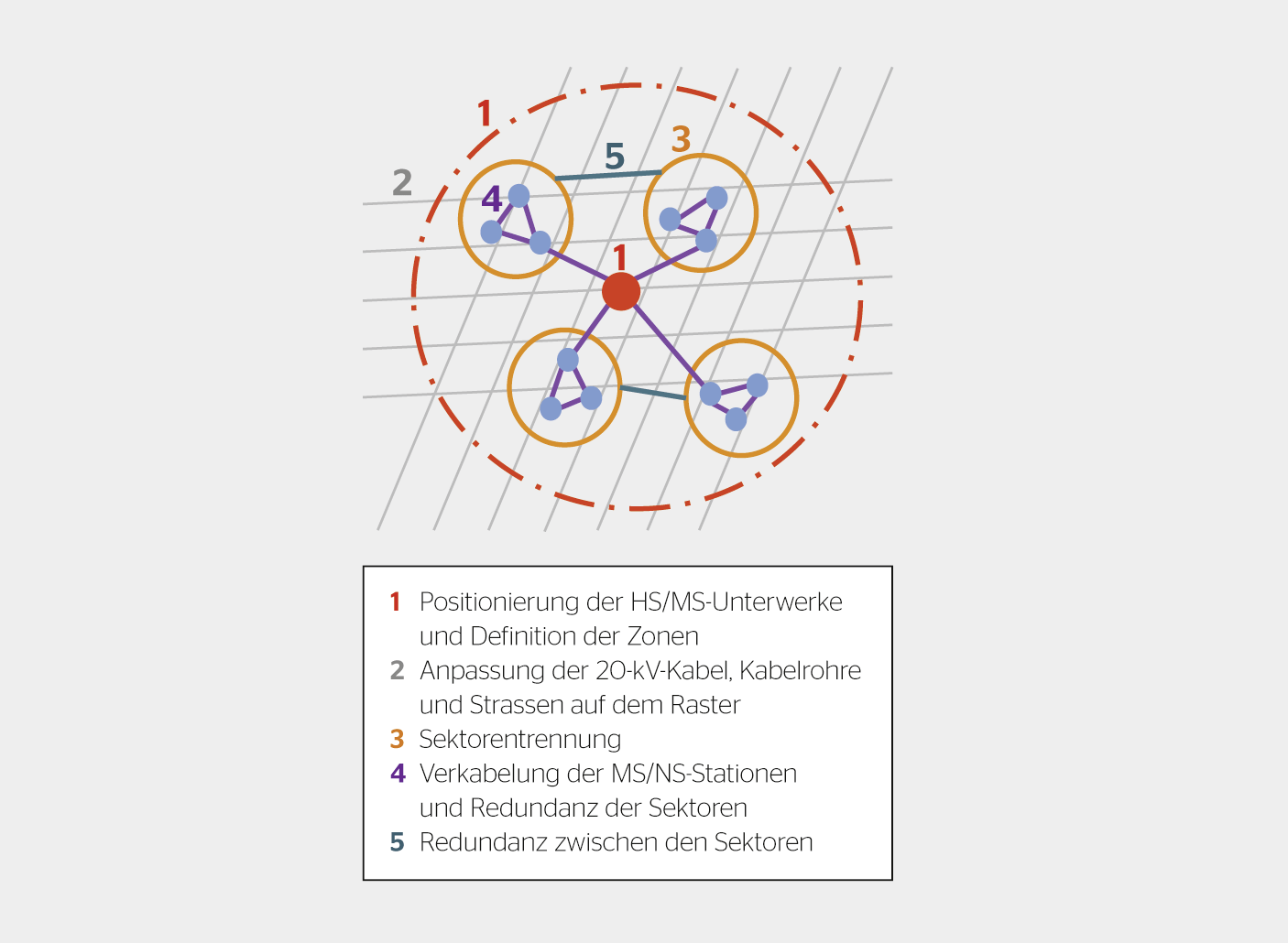 Im Vergleich zum aktuellen Zustand wurde eine Reduktion der Anzahl Unterwerke und Schaltstationen sowie eine Abnahme der gesamten Länge der MS-Kabel angestrebt. Als vereinfachte Hypothese wurde nur ein Kabeltyp für das ganze Netz gewählt.