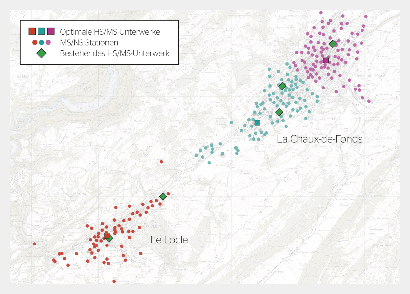 Im Fall der Städte La Chaux-de-Fonds und Le Locle wurden die Simulationen für eine unterschiedliche Anzahl von HS/MS-Unterwerken durchgeführt. Bild 2 zeigt das Ergebnis mit drei Unterstationen. Die theoretisch optimalen Standorte wurden mit den Positionen der aktuellen Unterwerke verglichen. Um grösstmöglichen Nutzen aus der vorhandenen Infrastruktur in Bezug auf Hoch- und Tiefbau zu ziehen, wurden diejenigen bestehenden Unterwerksstandorte identifiziert, die den optimalen Standorten am nächsten kommen. Diese Standorte wurden als Ausgangspunkt zur Bestimmung der Kabelnetztopologie festgelegt.