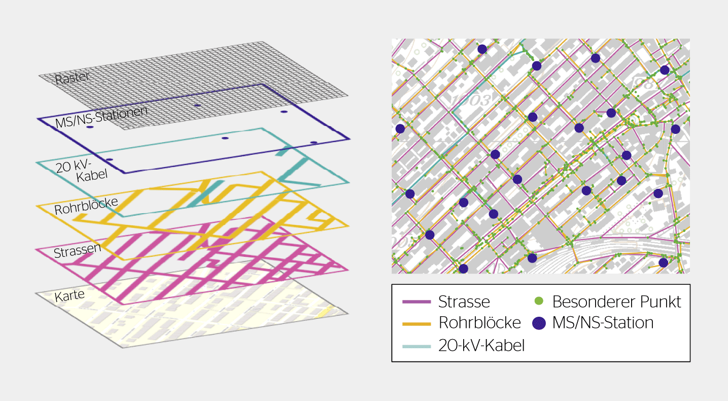 All diese Informationen werden auf ein Gitter mit 5-m-Raster abgebildet. Zwischen zwei spezifischen Punkten wird die Verbindung mit den jeweils minimalen Investitionskosten ausgewählt und vermerkt.