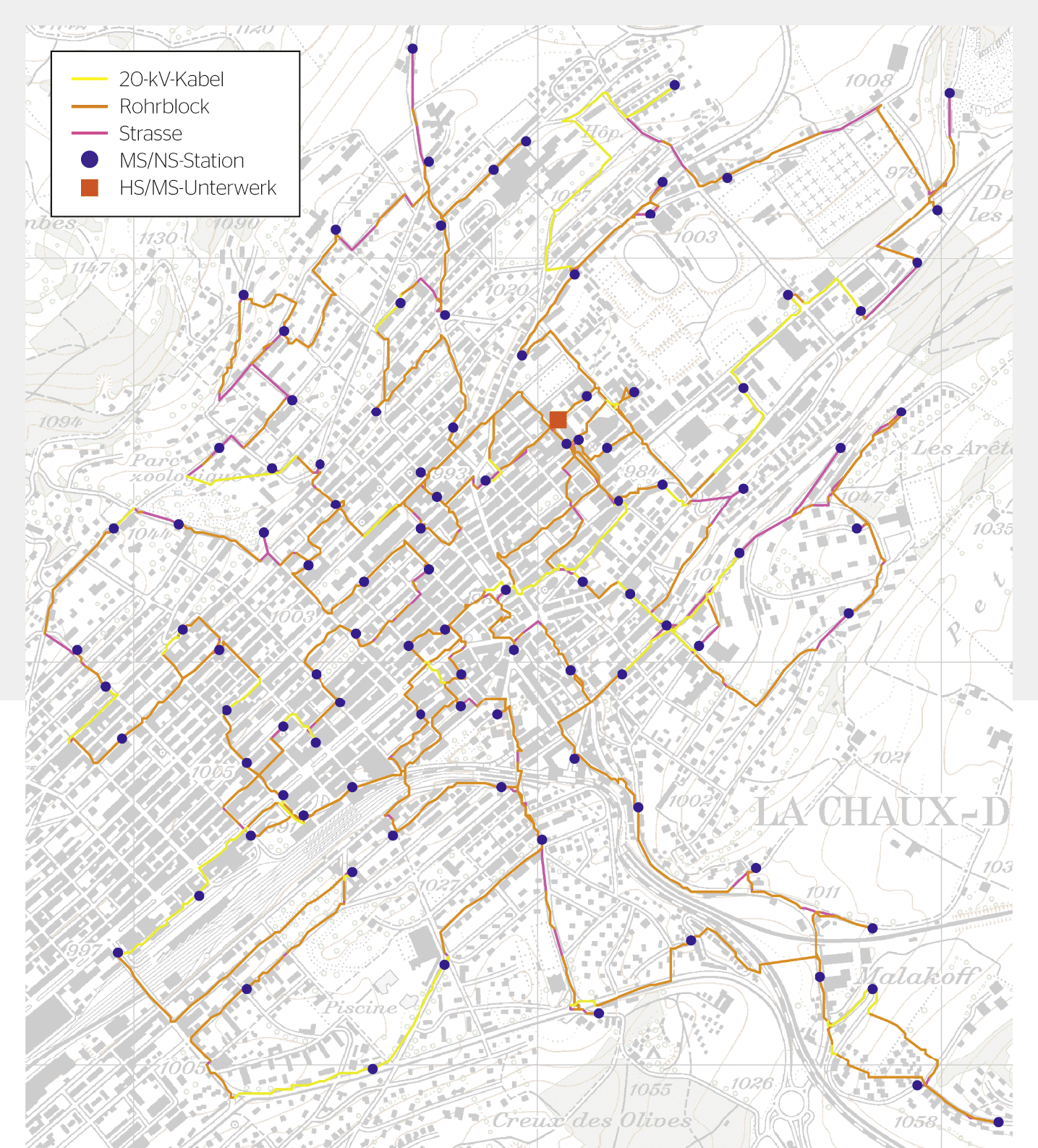 Die Aufgabenstellung lag in der Festlegung der zukünftigen 20-kV-Netztopologie, um es Viteos zu ermöglichen, die notwendigen Investitionen frühzeitig zu planen. Dieses MS-Netz soll die Versorgung aller Verbraucher gewährleisten, auch wenn ein beliebiges Netzelement nicht verfügbar ist: Kabelverbindung, HS/MS-Transformator oder MS-Sammelschiene. Um Auswirkungen auf das NS-Netz zu vermeiden, wurden die Standorte der heutigen MS/NS-Stationen beibehalten. Diese wurden durch einige zusätzliche Stationen für die Lastabdeckung der vorgesehenen Entwicklungen ergänzt.