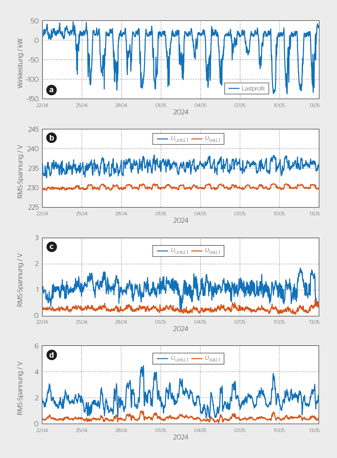 Seit der Inbetriebnahme des Reglers erfolgte eine Messbegleitung durch die OST. Bild 2 zeigt einen Ausschnitt der im Zeitraum vom 22. April bis 13. Mai 2024 aufgenommenen Messdaten des EVOCDTRs. Dabei wurde der Übersichtlichkeit halber nur jeweils eine Phasenspannung dargestellt. Die anderen Phasenspannungen weisen dabei gleiches Verhalten auf.