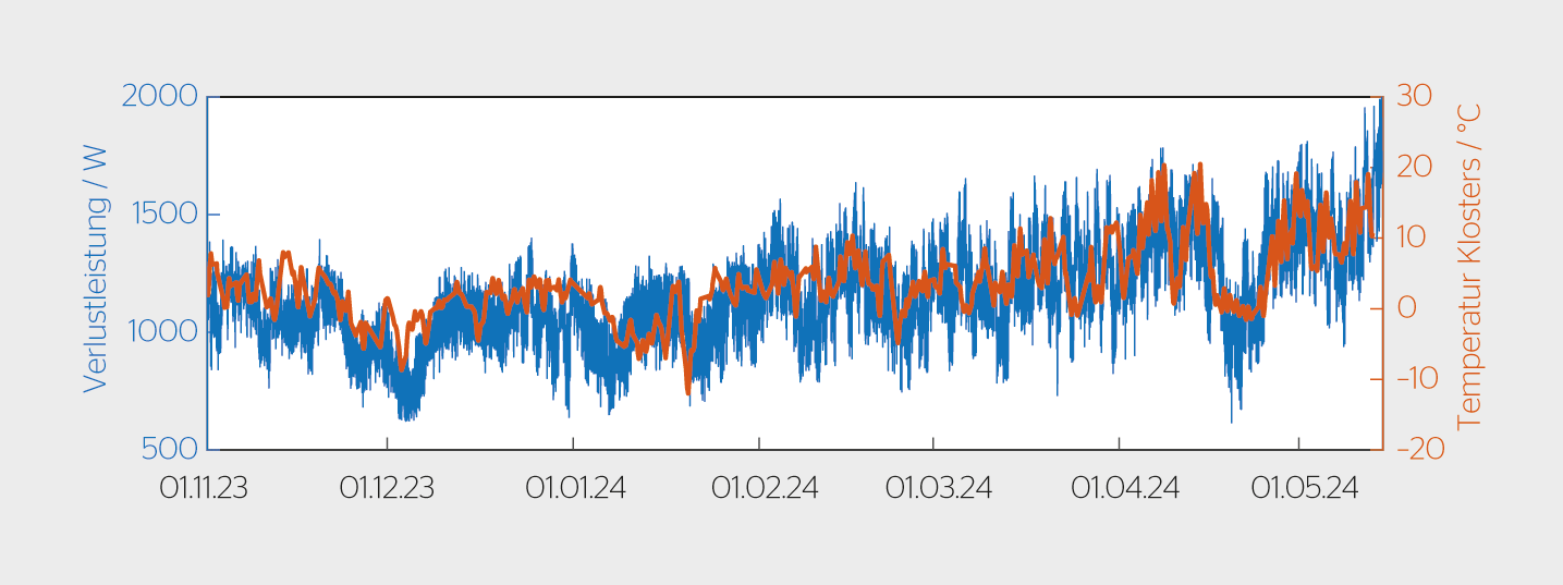 Zur Optimierung der Effizienz wurde die Verlustleistung des EVOCDTRs über ein halbes Jahr analysiert. Dabei wurde festgestellt, dass die Verlustleistung mit der Aussentemperatur in Klosters [7] korrelierte (Bild 3). Bisher wurde der Schaltschrank bei Innentemperaturen unter 20°C geheizt bzw. ab 25°C mit einer Klimaanlage gekühlt. Für Kühlung, Heizung, Verlustleistung der Halbleiter und für den Verbrauch der Steuerung wird im Mittel rund 1,3 kW benötigt.
