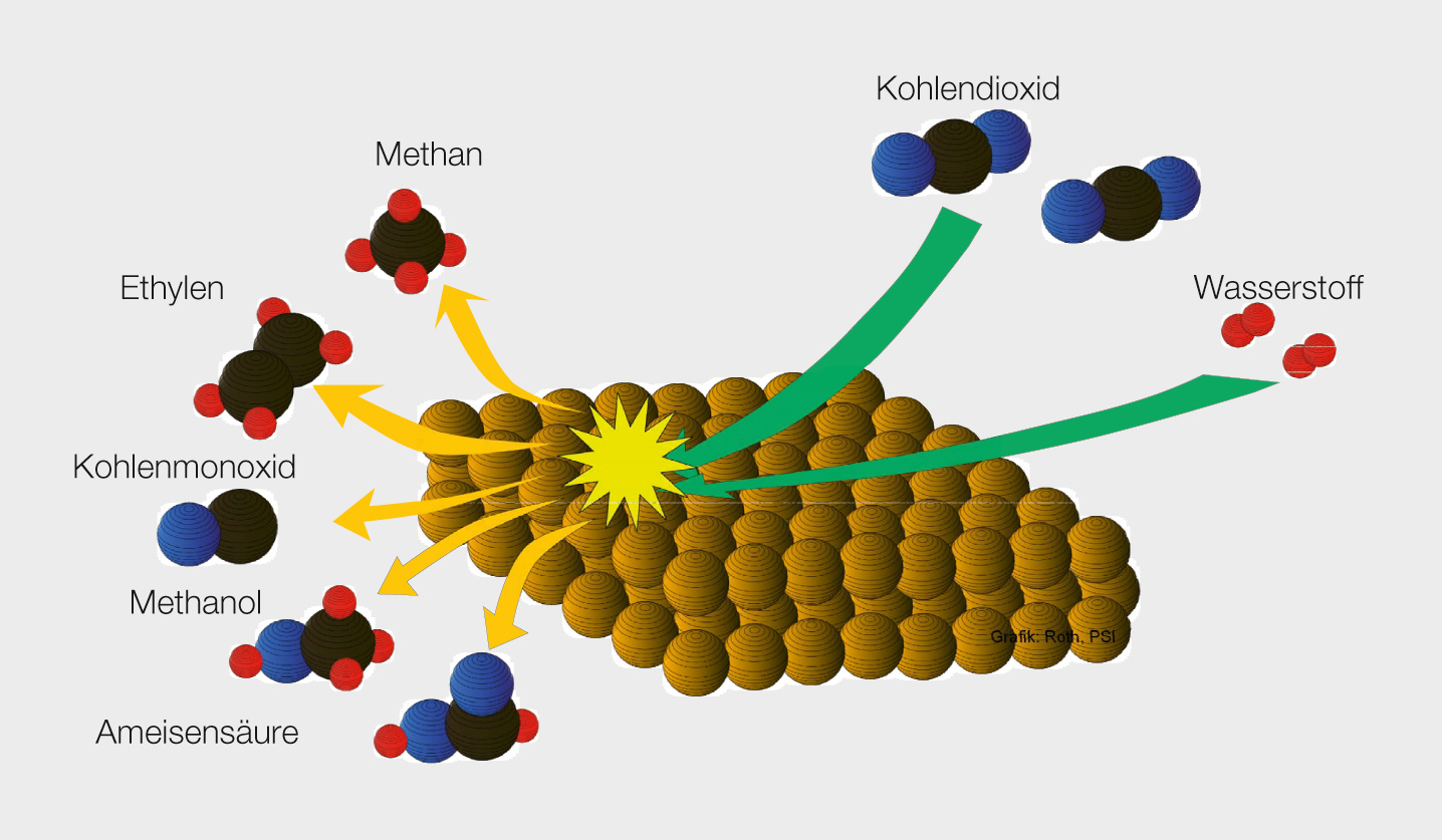 Einen Schritt weiter geht die Synthese der bereits erwähnten Kohlenwasserstoffe aus CO2, Wasser und (elektrischer) Energie. Derzeit wird dieser Ansatz in Methanisierungsanlagen im Pilotmassstab eingesetzt. Der Prozess basiert auf der Sabatier-Reaktion und ist auf die Verfügbarkeit von Wasserstoff angewiesen, der meist mittels Elektrolyse erzeugt wird. Bei Temperaturen bis zu 400°C mit Hilfe von Katalysatoren auf Basis von Metall(-oxiden) wird Methan erzeugt. [1] Die visionäre Weiterentwicklung dieser Idee ist es, direkt aus Wasser und Kohlendioxid Kohlenwasserstoffe (und nicht nur Methan) zu gewinnen. Die hierzu innerhalb des Kompetenzzentrums untersuchten Ansätze umfassen die Metall-organische Katalyse zur CO2-Reduktion sowie die direkte elektrochemische Umsetzung von CO2 und Wasser zu Methan, Ethen, Methanol und anderem (Bild 2). Der Vorteil des ersten Ansatzes liegt in der Möglichkeit, hochselektive Katalysatoren unter milden Prozessbedingungen einsetzen zu können, was sich positiv auf die Kosten und die Anlagengrösse auswirkt. Die direkte elektrochemische Reduktion von CO2 ist von der technischen Anwendung noch weiter entfernt, jedoch konnte die Machbarkeit nachgewiesen werden. Nun wird die Selektivität und Haltbarkeit der Elektroden optimiert. Langfristig sollte es damit möglich sein, Grundchemikalien der organisch-chemischen Industrie aus überschüssiger Elektrizität zu gewinnen.