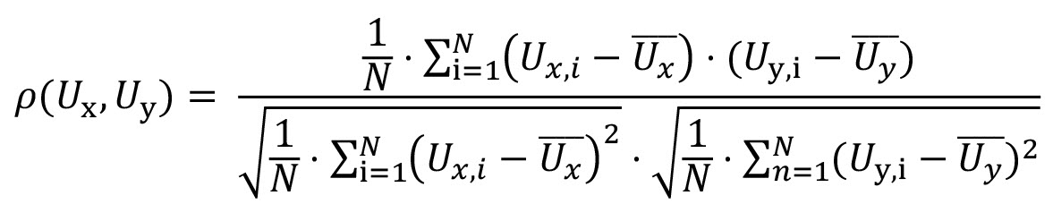 Basierend auf den generierten Spannungszeitreihen wird die Netztopologie bestimmt. Da der Spannungsverlauf entlang jeder Leitung aufgrund der spezifischen Kombination aus Lasten und Erzeugern für die jeweilige Leitung individuell ist, können aus der Ähnlichkeit der Spannungszeitreihen Rückschlüsse auf die Verbindung der Netzknoten gezogen werden. Um die Ähnlichkeit der Spannungsverläufe der Netzknoten x und y über alle Zeitschritte i = 1, ..., N zu quantifizieren, wird die Pearson-Korrelation nach der untenstehenden Formel verwendet.
