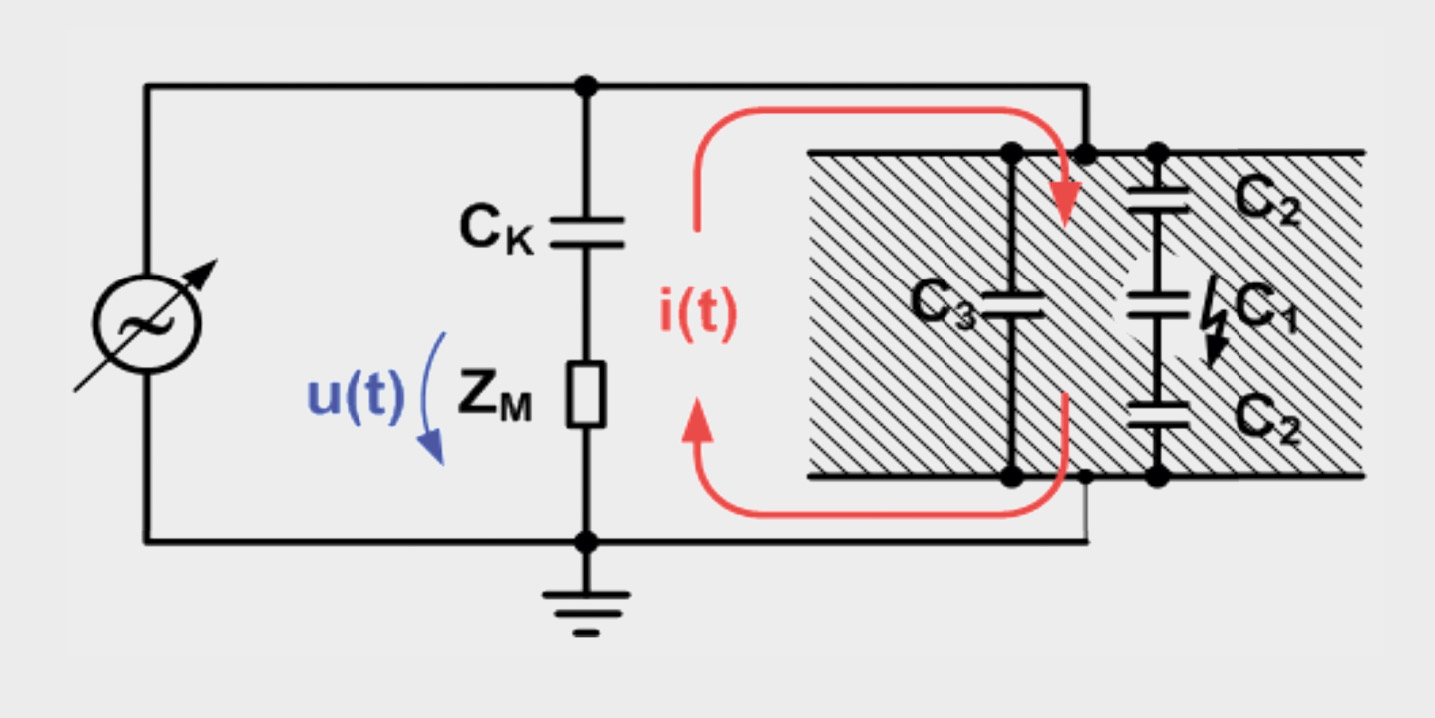 Die Hohlräume können beispielsweise aufgrund mechanischer Spannungen durch Materialschwund während der Gelie-rungsphase und/oder Lufteinschlüssen während des Herstellungsprozesses entstehen. Da Grösse und Lage des Defektes im Isolationssystem von aussen nicht bestimmt werden können, ist die im Defekt umgesetzte Ladung nicht direkt messbar. Statt-dessen können die Ausgleichströme i(t) im äusseren Messkreis über eine Messimpedanz erfasst und im Zeit- oder üblicherweise im Frequenzraum integriert werden. Diese «scheinbare Ladung» wird vor der Messung durch die Einspeisung einer bekannten Ladung in [pC] normiert.