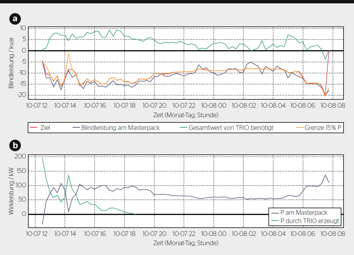 Zur Kompensation von Blindleistung muss der Arbeitspunkt jedes Wechselrichters entsprechend der in der Fabrik aktuell erzeugten Blindleistung geregelt werden, um die erforderliche Blindleistung zu produzieren. ABB Schweiz hat den Regler für das Pilotprojekt entwickelt und programmiert. Die entsprechenden Daten werden werkseitig am Transformator erfasst, der das Niederspannungsnetz der Schokoladenfabrik an das Mittelspannungsnetz anschliesst, und von dort zum Regler übermittelt.