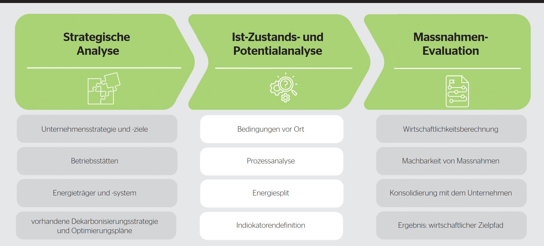 Die Zielvereinbarung ist so individuell wie das Unternehmen. Die vom Bundesamt für Umwelt (Bafu) und vom Bundesamt für Energie (BFE) akkreditierten Energieberater kennen die genauen Anforderungen, Herausforderungen und Möglichkeiten. Sie erarbeiten die passende Variante für das Unternehmen. Um die Prozesse, Bedürfnisse und Anforderungen zu verstehen, ist ein intensiver Austausch auch auf strategischer Ebene wichtig – genau diesen Ansatz verfolgen die Spezialisten.